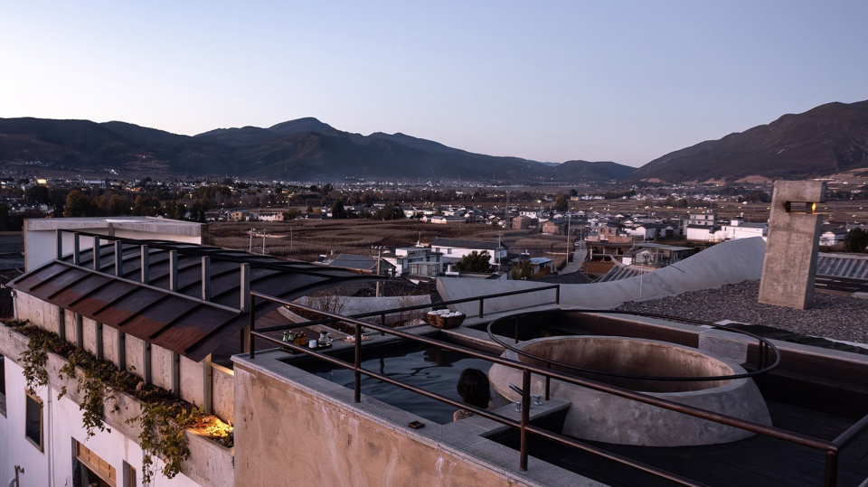从院子里,为了得到向外瞭望的丰富视角,把西区和北区的二层独立客房体量控制得比较短,形态上也想和远山、华丽的天光云彩之间,产生特别的张力。每个区每一层的地面标高、房间层高,各不相同、环环相扣,总是让人在体感上不由自主地移动,被不停切换的视野所牵引。