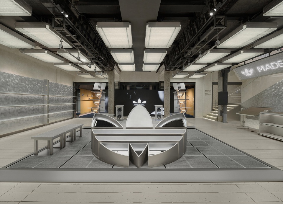 An open layout fuses rugged historical textures with refined modern materials, creating a retro-industrial aesthetic aligned with the brand identity of adidas Originals. At the heart of the space, a central display fixture takes the form of the iconic Trefoil logo, framed in metal to spotlight signature products. Here, the space moves beyond passive product display—modular frameworks and interactive installations activate the environment, making it dynamic, flexible, and socially engaging.