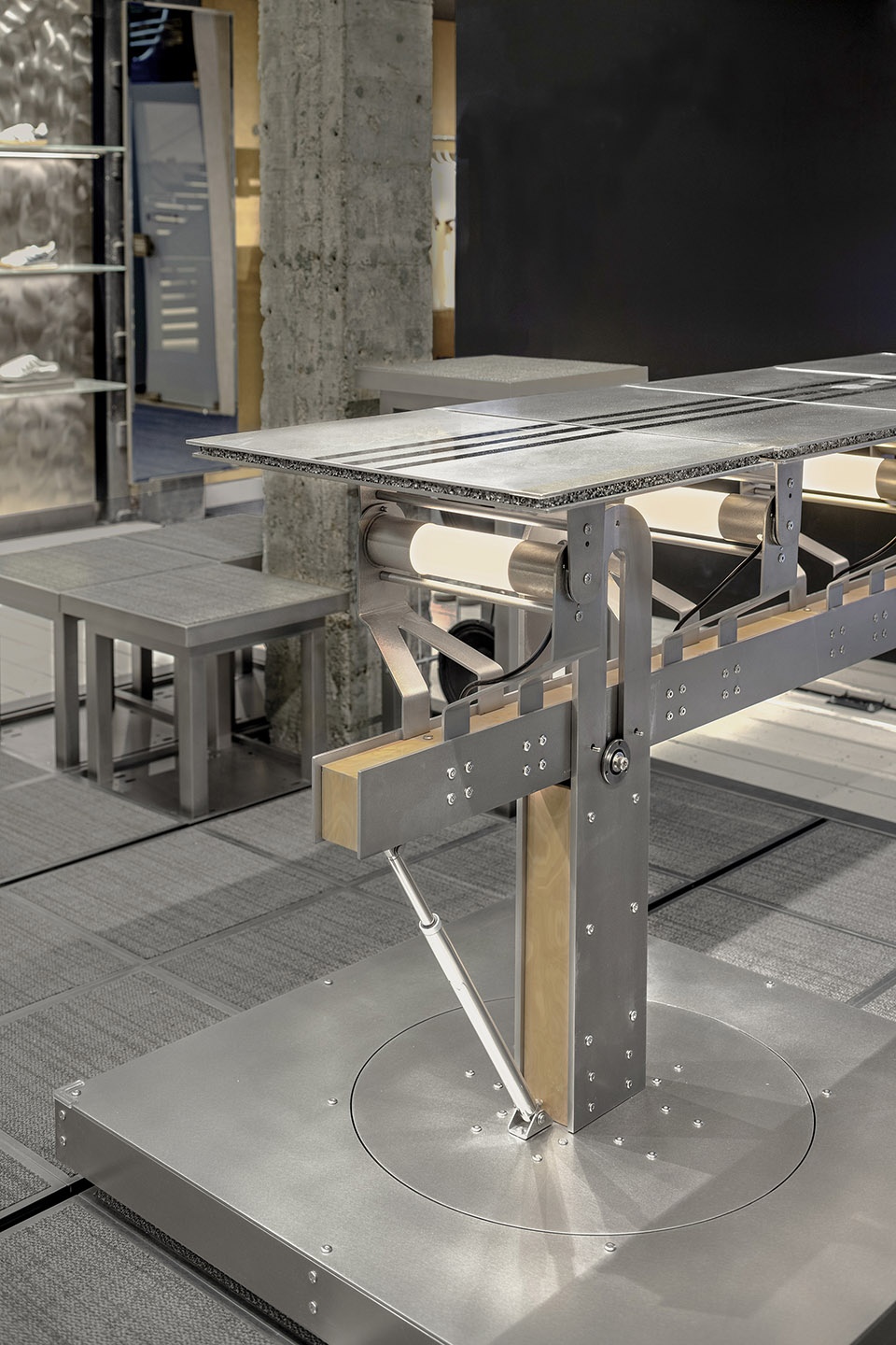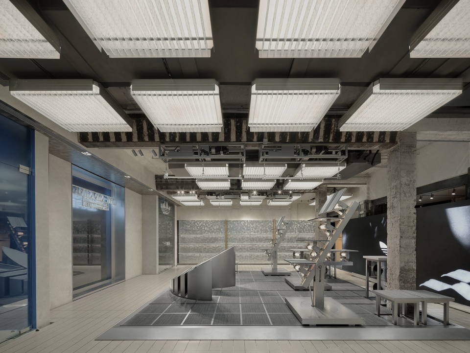 Inspired by the geometry of skateboard axles and wheels, linear lights extend across the ceiling to form a “hovering street playground” overhead. Trefoil-embossed glass transforms into a series of display shelves, paired with stainless steel profiles and digital screens. The orderly displayed footwear narrates the genetic code of street culture.
