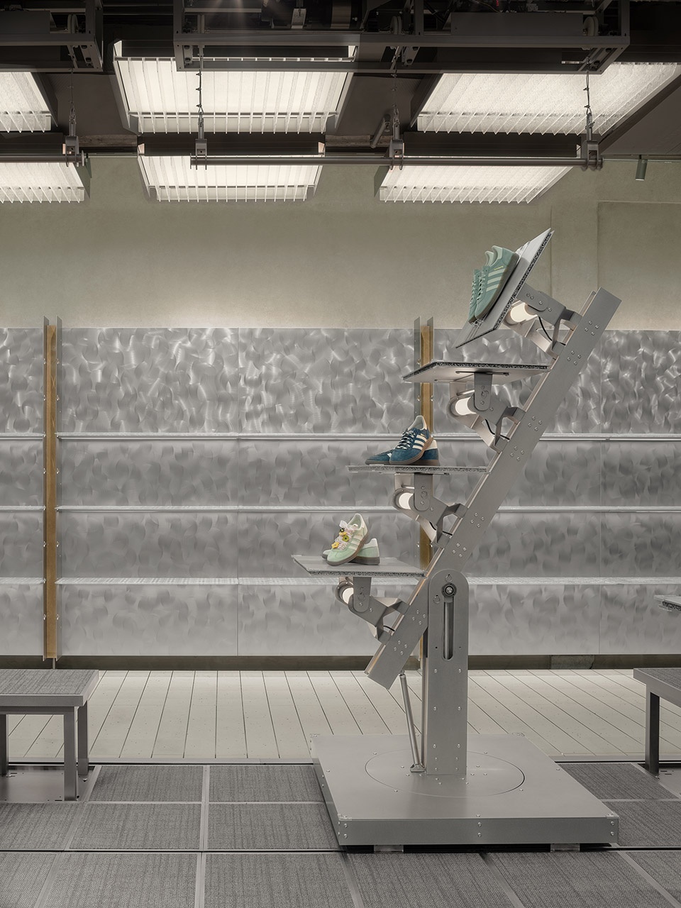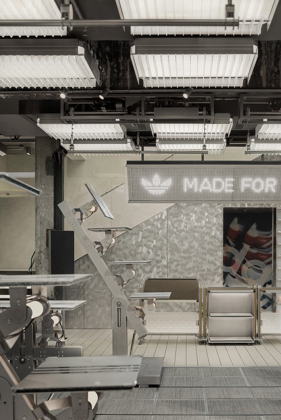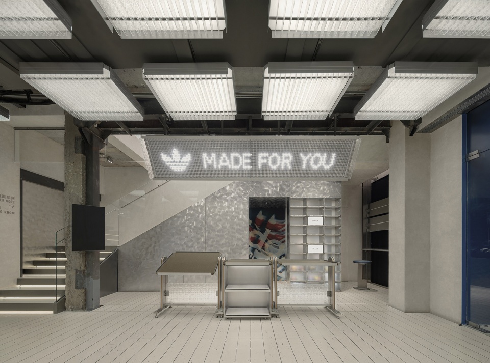 Suspended overhead, the MADE FOR YOU signage glows in pixelated lighting—a nod to the digital influence interwoven with today’s street culture. The same material palette extends to the customization station, where retro embossed glass stamped with the Trefoil logo pairs with sleek metal supports, creating a tactile contrast of softness and strength.