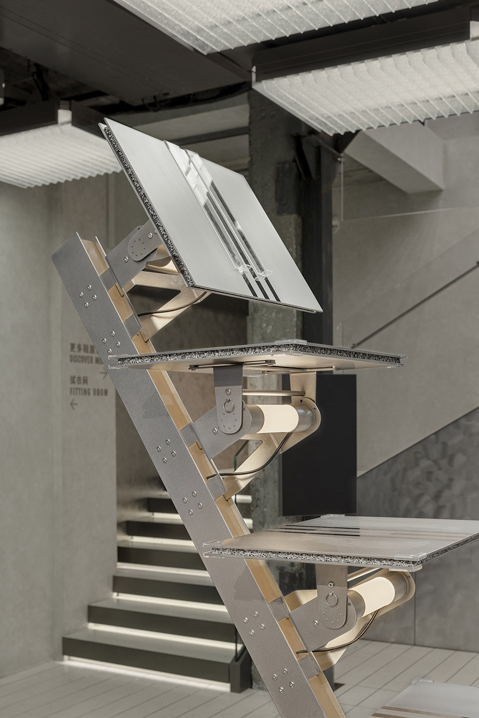 Stepping into the ground floor space, visitors are greeted by a kinetic centerpiece—an automated arm installation inspired by the louvered shutters of old Shanghai architecture. Capable of rotating and folding, it creates a shareable, immersive atmosphere—quickly becoming one of the store’s most photographed moments on social media.