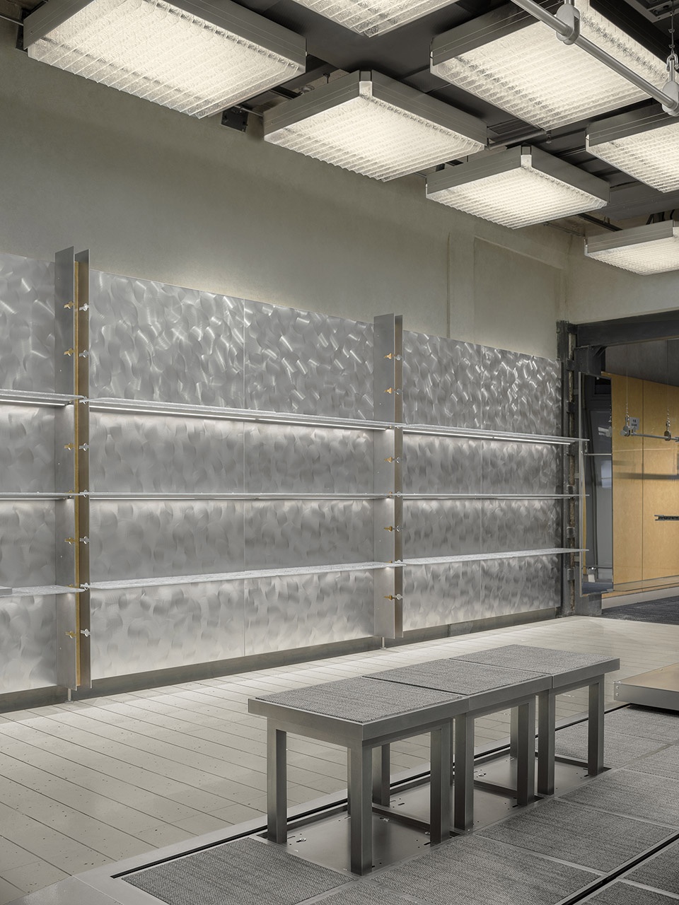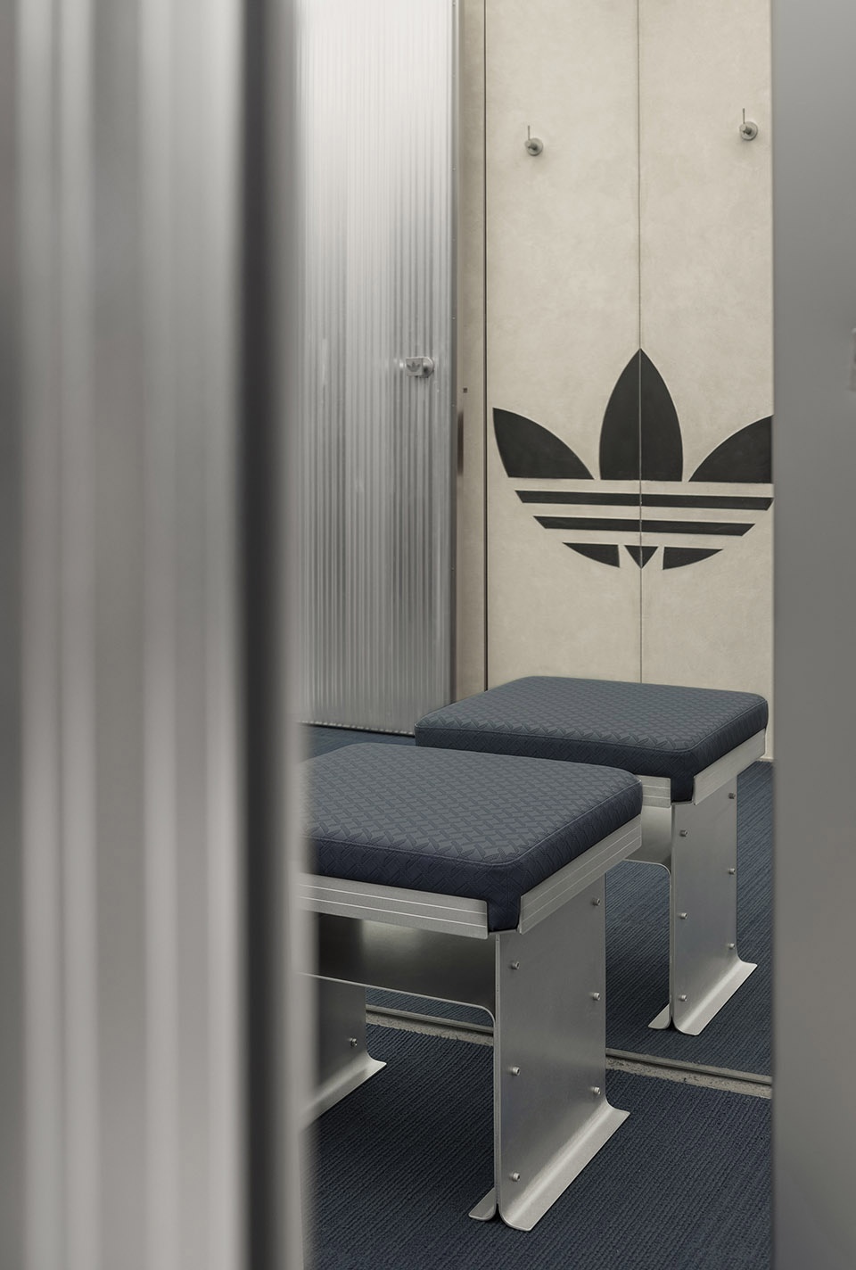 The fitting rooms on the upper floor reimagine the try-on experience with a futuristic touch. Rippled silver-metal walls contrast with soft blue carpeting. The Trefoil emblem strengthens the brand resonance, as customers shift from visual browsing to personal try-ons — completing the shopping journey.