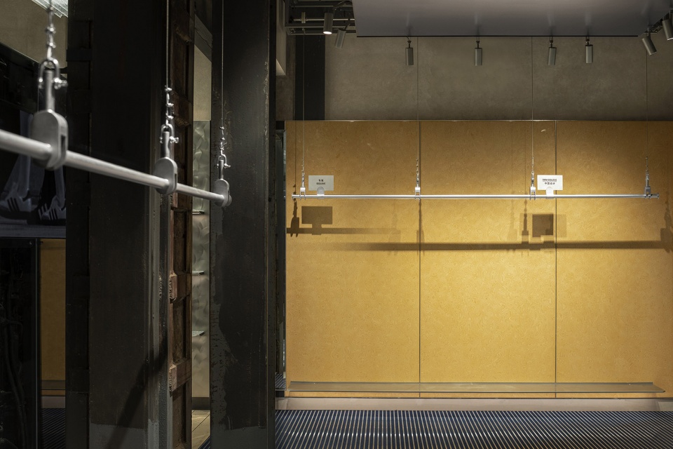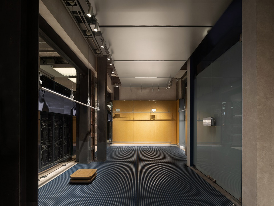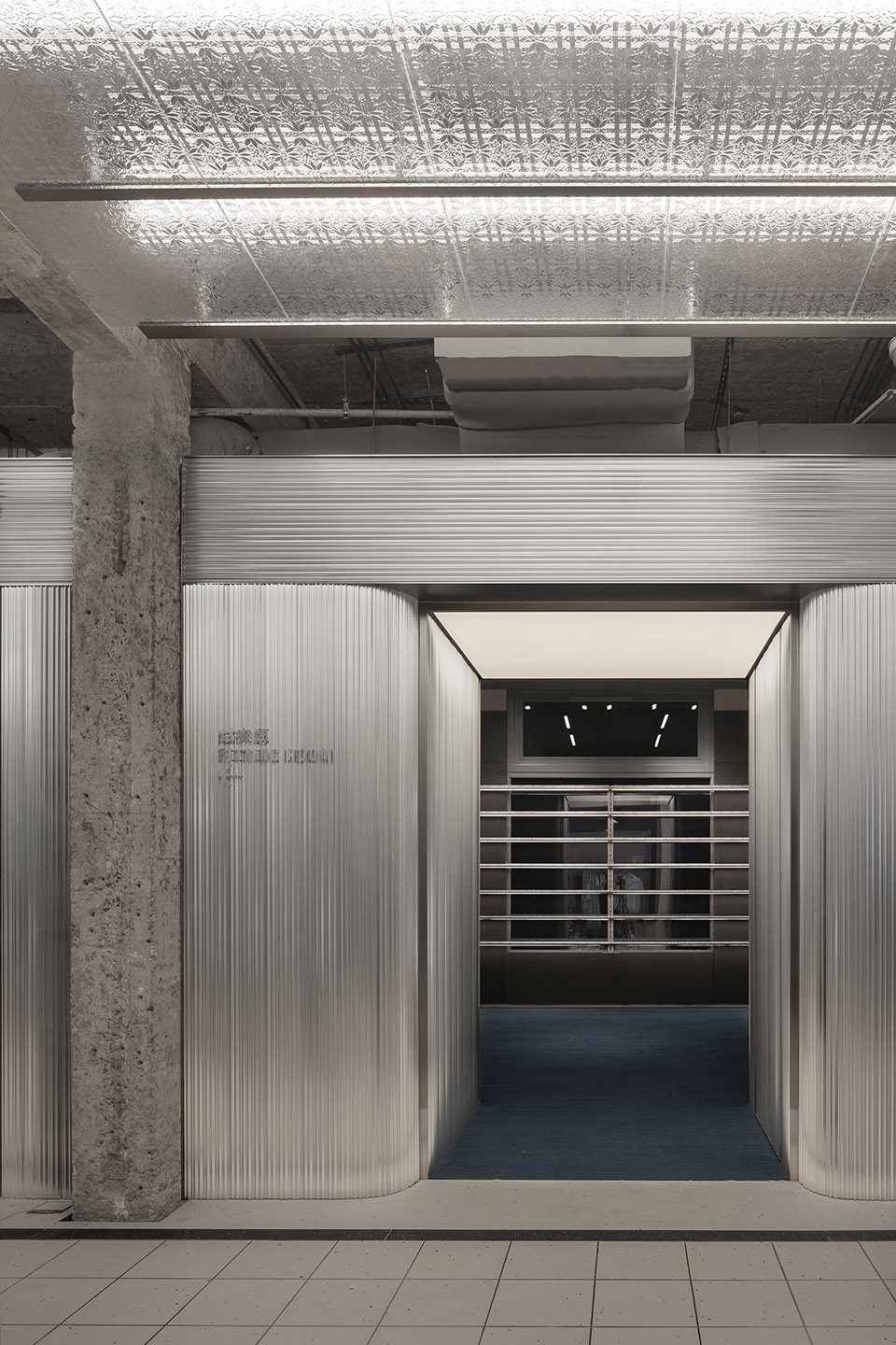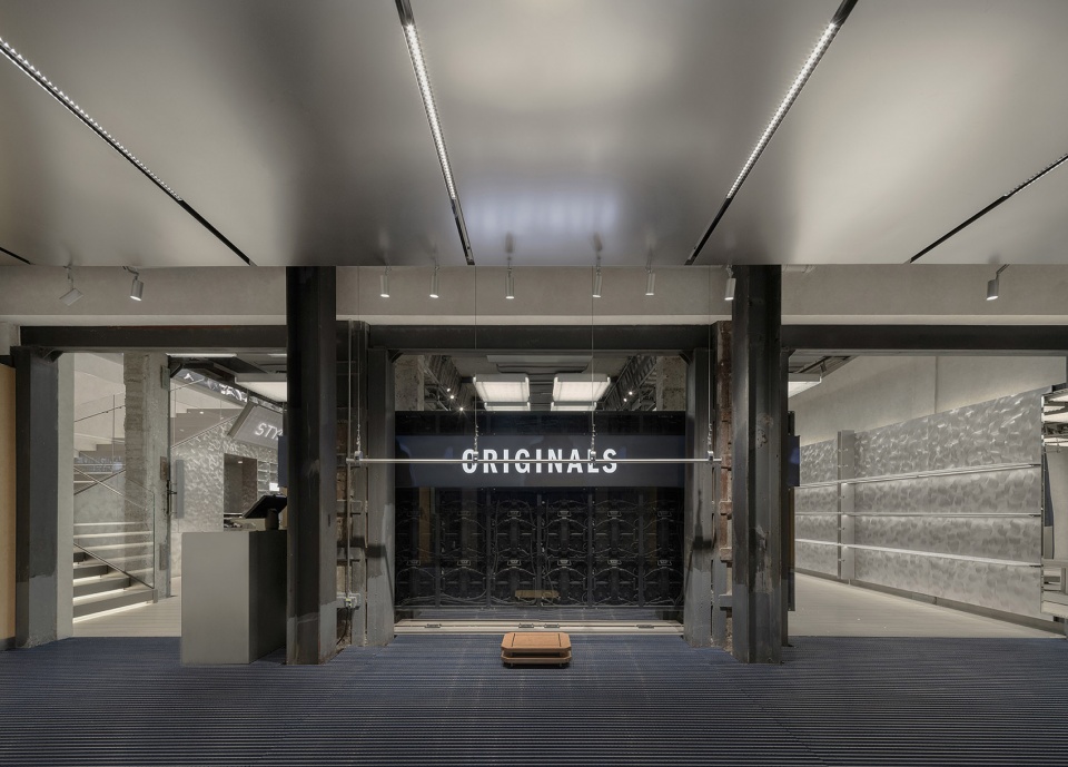 The back area of the ground floor continues the bold, cool tone, with matte stainless steel outlining sleek spatial contours. Light wood veneers and dust mats soften the metal’s chill, adding warmth and balance. Behind the front display screen, deliberately exposed wiring resonates with the coarse textures of the original building. Overhead, a blend of point and linear lighting draws focus to the ORIGINALS signage, crafting a rear zone infused with strong brand identity.