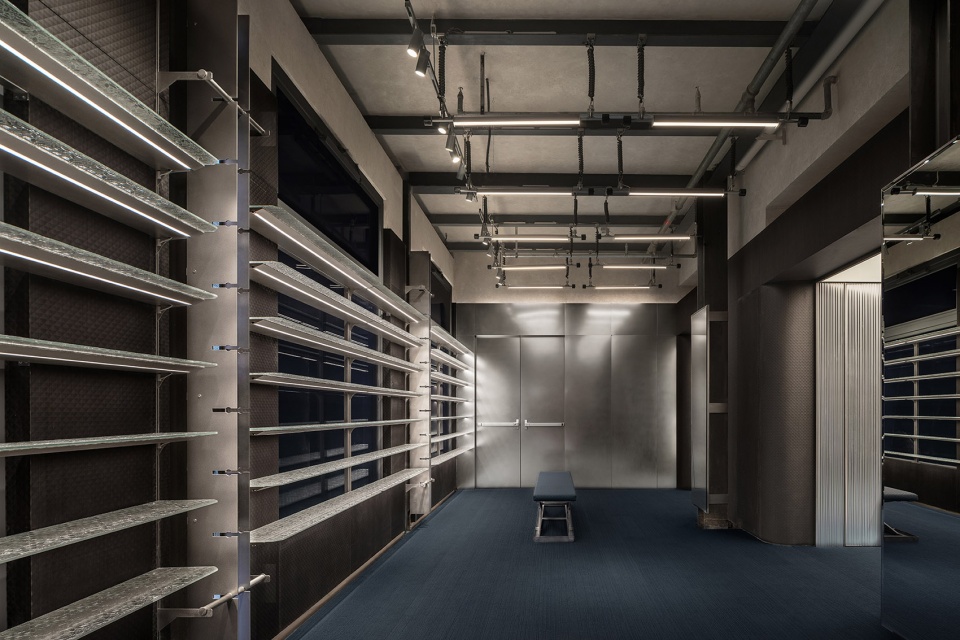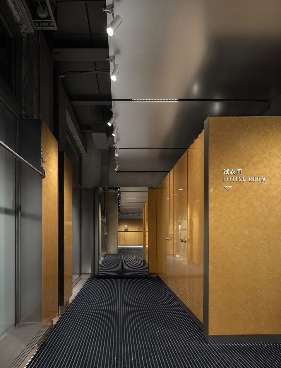 门店后场延续整体硬朗基调,以砂面不锈钢勾勒硬朗轮廓,浅色木饰面展台与防尘毯融入中和金属冷感。前区屏幕背后的设备线缆被特意展露,恰与原建筑结构的粗粝肌理,形成呼应。顶部点状光源与线性灯光结合,聚焦ORIGINALS 标识,营造具品牌辨识度的后场空间。