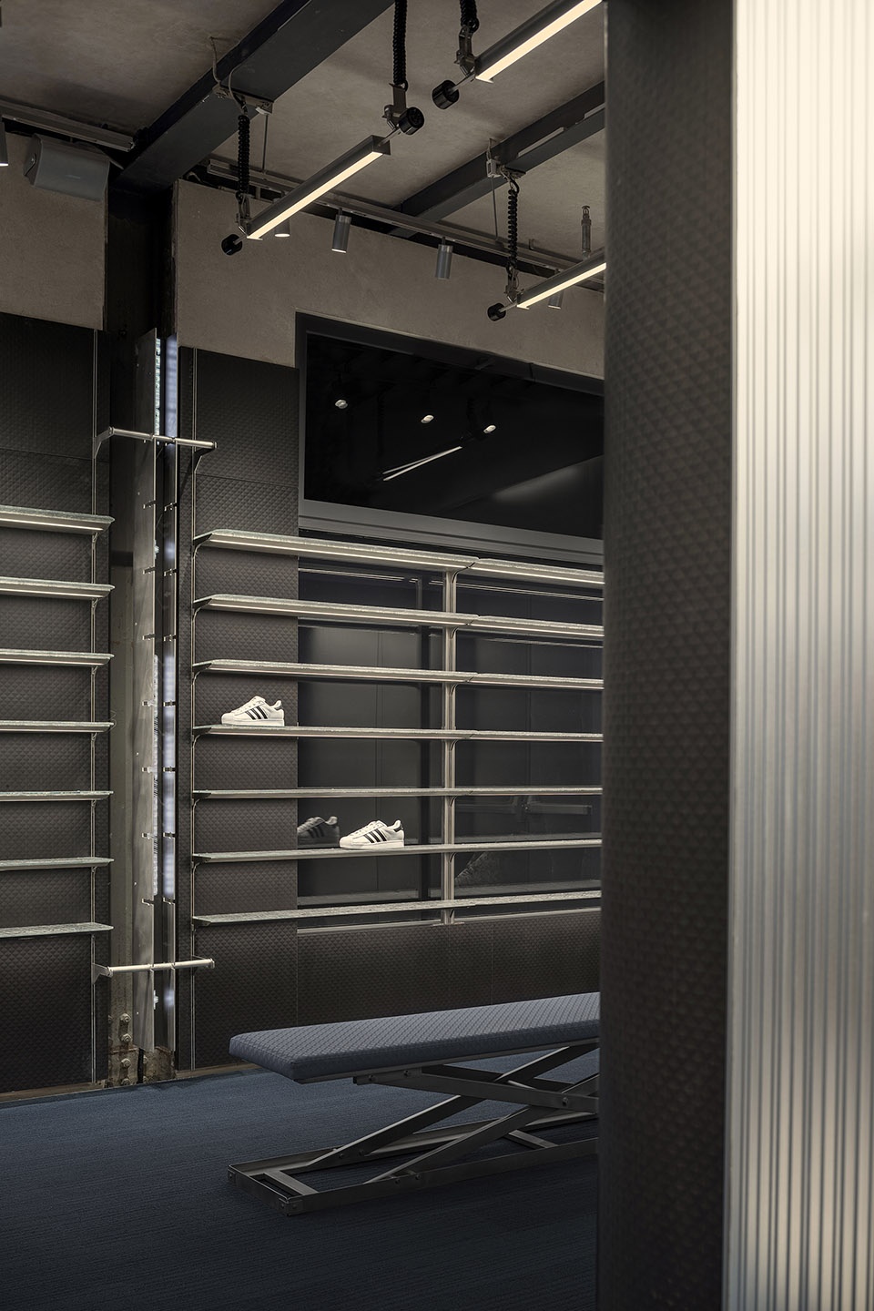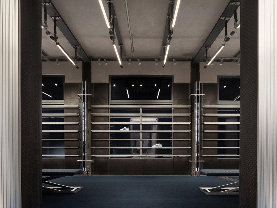 The ground-floor fitting rooms blend mirrored surfaces with wood-toned finishes, merging industrial coolness and fashionable warmth. Light panels create a soft ambiance, while custom mirrors expand visual depth, transforming each fitting moment into a ritual of self-exploration and personal style expression. A blue carpet echoes adidas Originals’ signature palette, enriching the refined and immersive fitting experience.