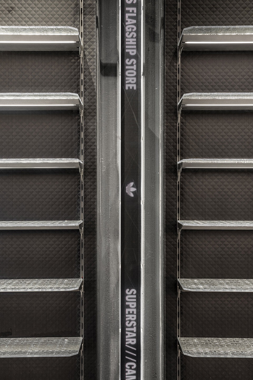 The staircase with higgen light strips becomes a multidimensional design statement, uniting the existing structure with terrazzo and stainless steel accents. A wall-sized poster highlights the spirit of adidas Originals, guiding consumer movement and facilitating a seamless visual transition between the two floors.