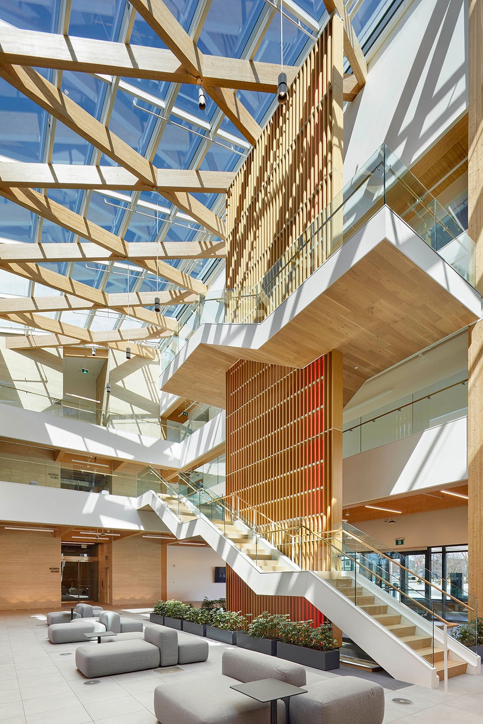 The building’s flexible, accessible infrastructure is concealed beneath elegant finishes, leaving the wooden ceiling exposed. The raised floor system allows all services to run beneath the floor, eliminating overhead ducts and conduits. This opens up the ceiling to highlight the exposed mass timber structure and supports long-term sustainability through displacement air and adaptable workspaces. A linear layout with minimal partitioning further supports adaptability, ensuring the space can evolve over time.