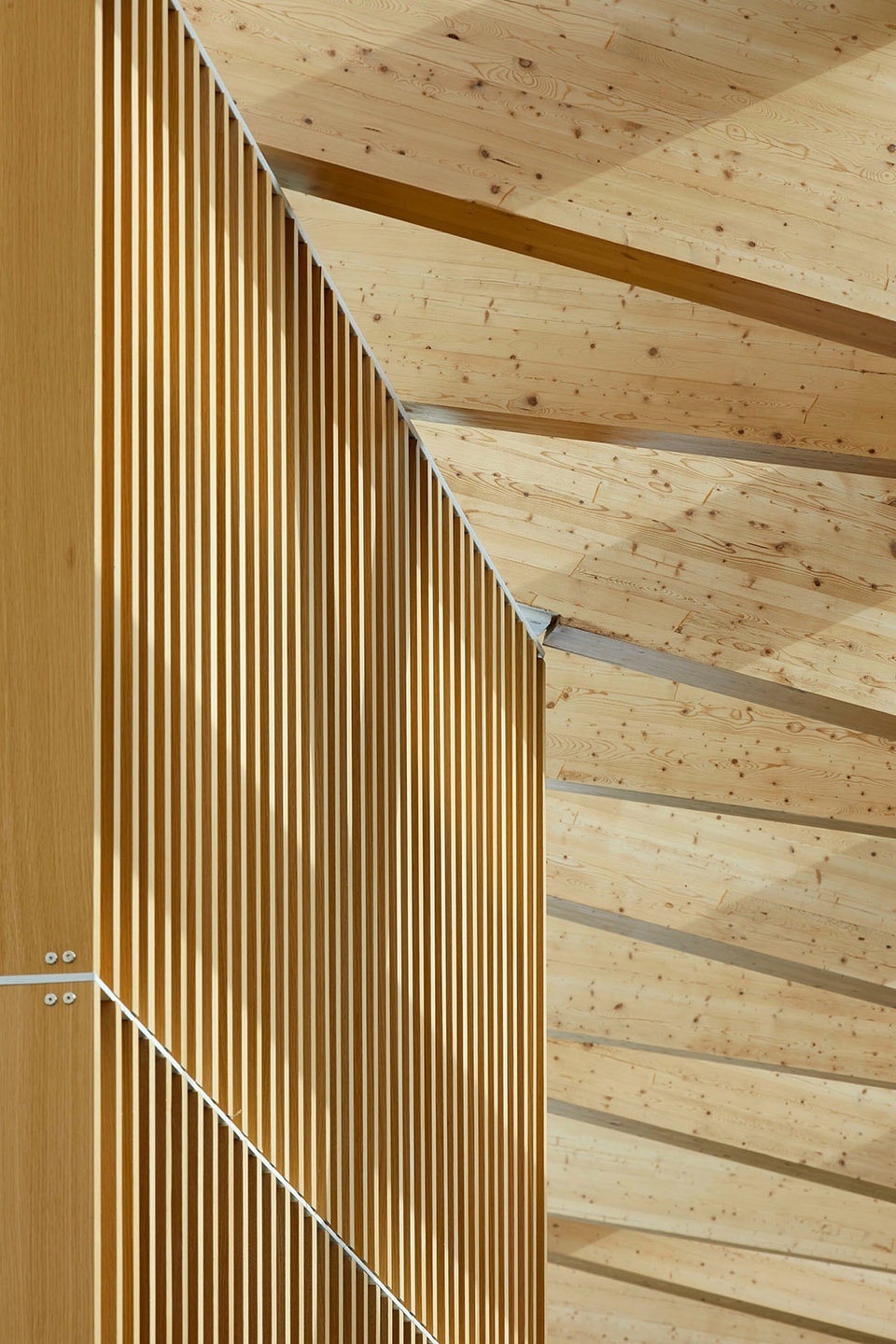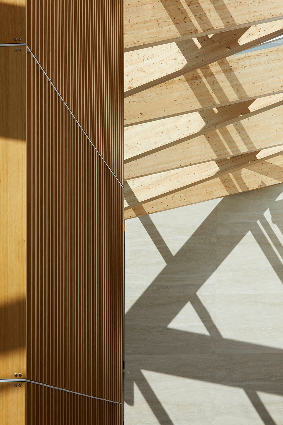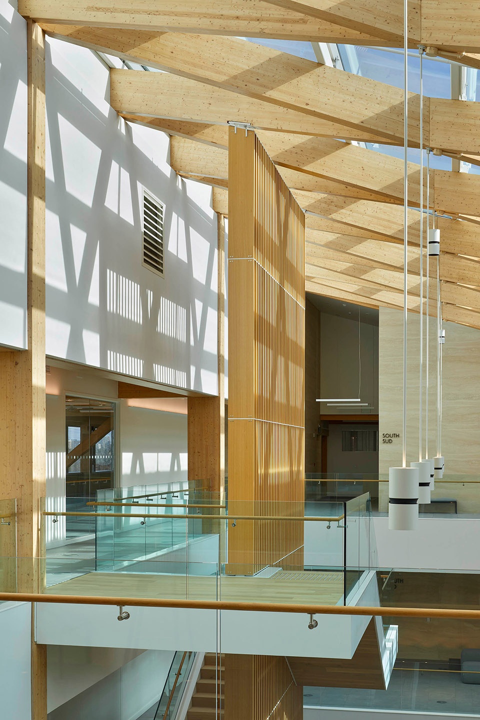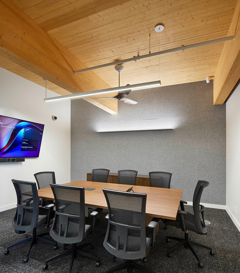 Finishes were selected to harmonize with the timber structure and evoke the surrounding ravine landscape. Subdued tones enhance warmth, while neutral carpet tiles with subtle texture add depth without visual distraction. Interior walls are finished in plain white and are complemented by acoustic panels of soft grey, adding to the timelessness of the space. Acoustic ceiling systems feature walnut slats with integrated absorptive material to reduce noise.