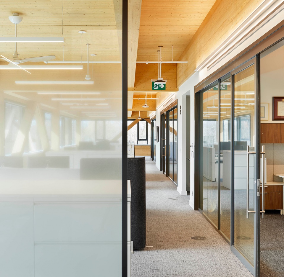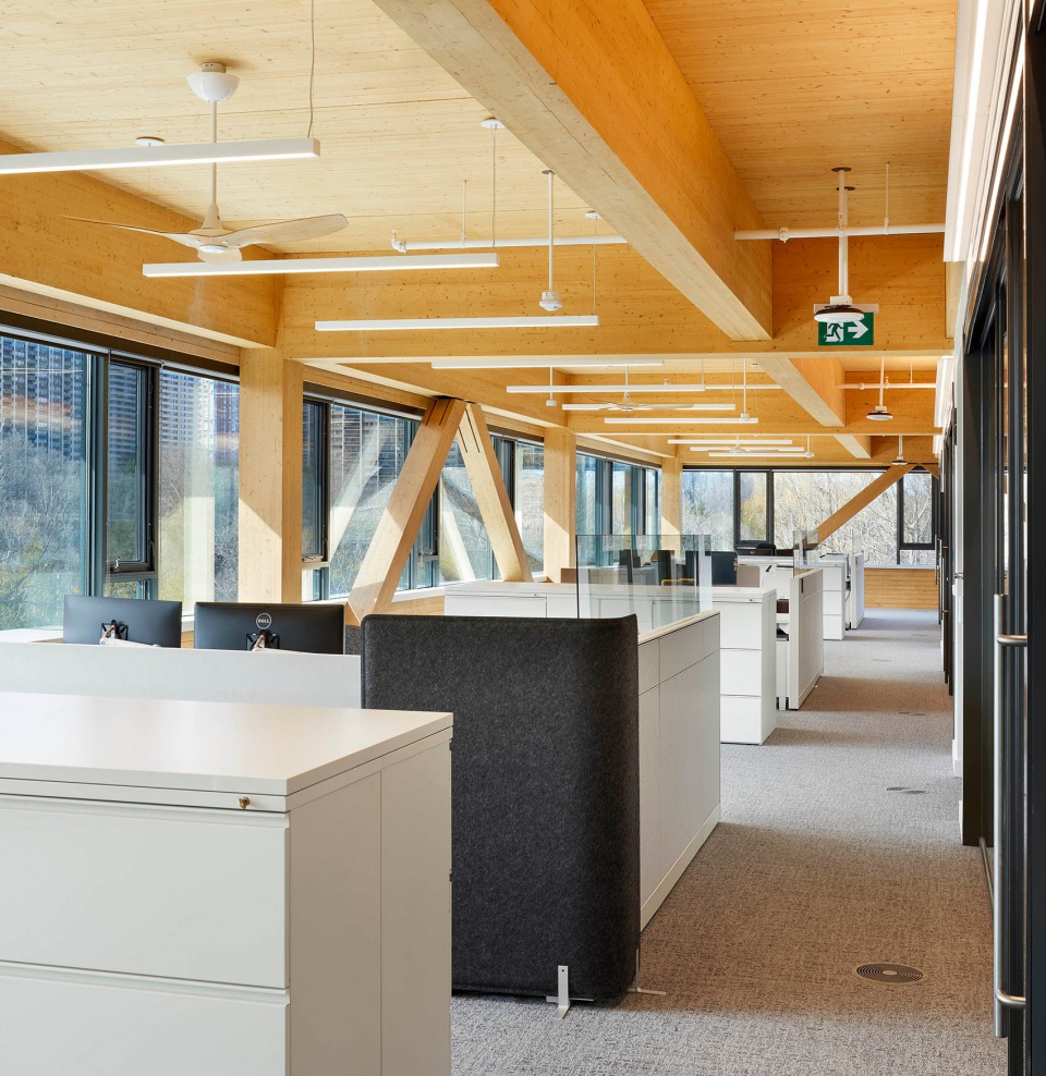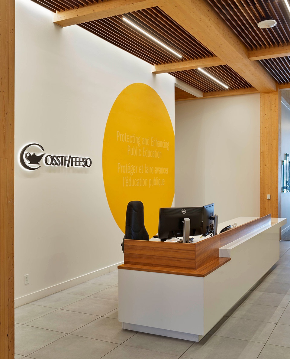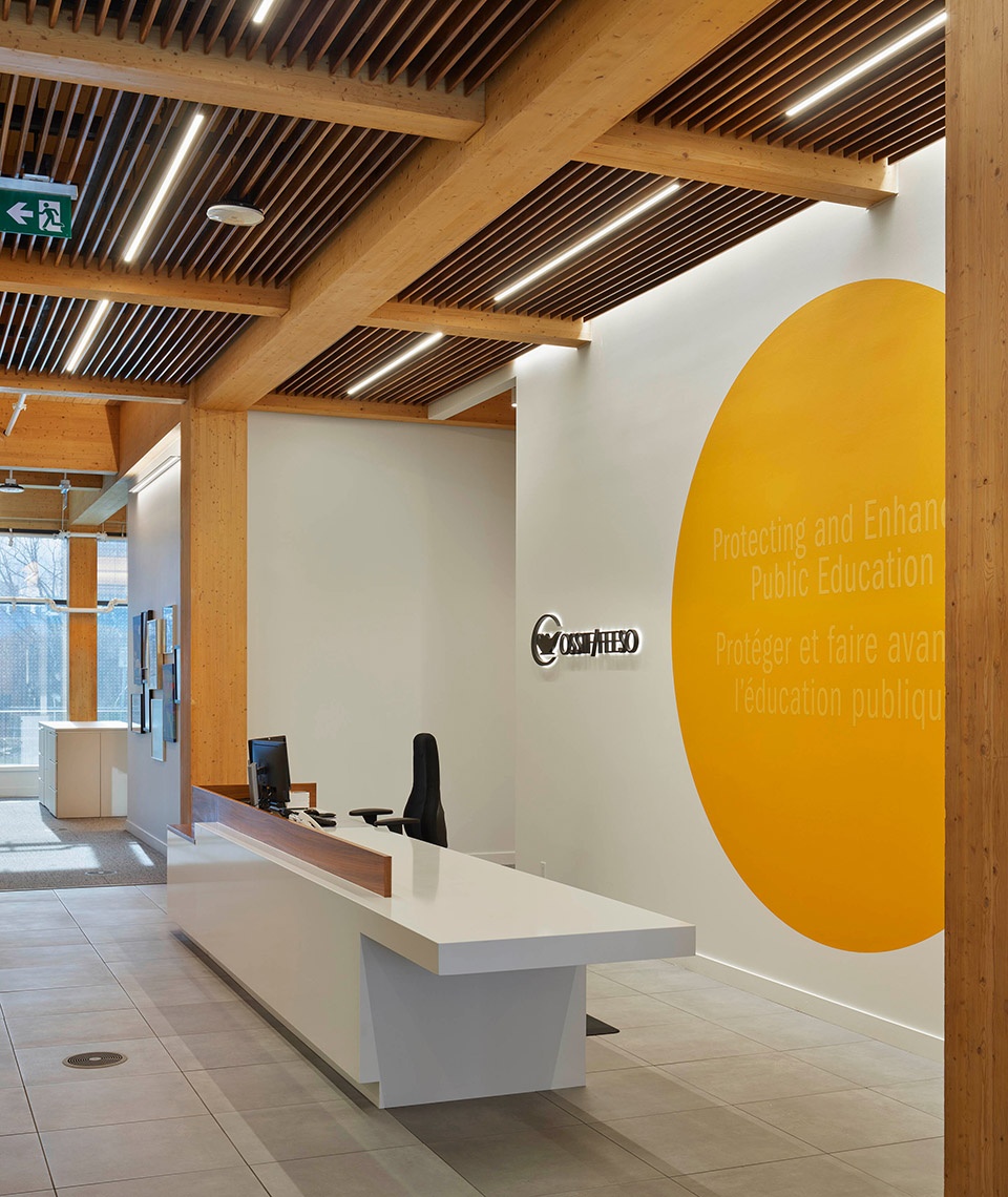 The design approach allowed the cross-laminated timber (CLT) and glue-laminated timber (GLT) structure to become the defining element of the space, complemented by a clean, monochromatic palette that highlights the natural beauty of the exposed wood. References to the OSSTF brand identity are thoughtfully integrated through modest accent colours and custom millwork.