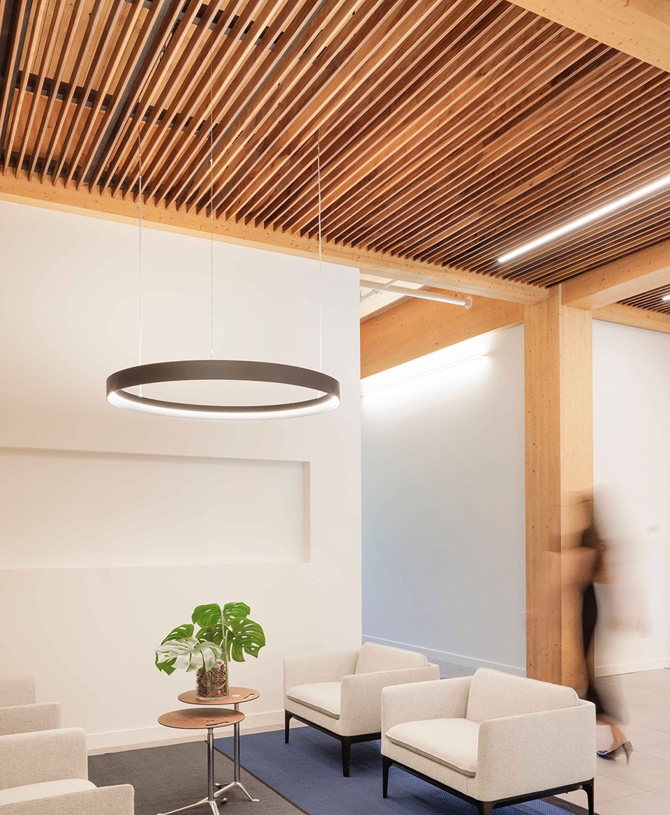 建筑的灵活与无障碍基础设施则隐藏于优雅的饰面之下,木质天花得以完全展现。架空地板系统容纳所有设备线路,避免天花上布满管线,并支持可持续的置换式送风与灵活的工位布局。简洁的线性空间布局与最少的隔断,确保空间具备长远的适应性。