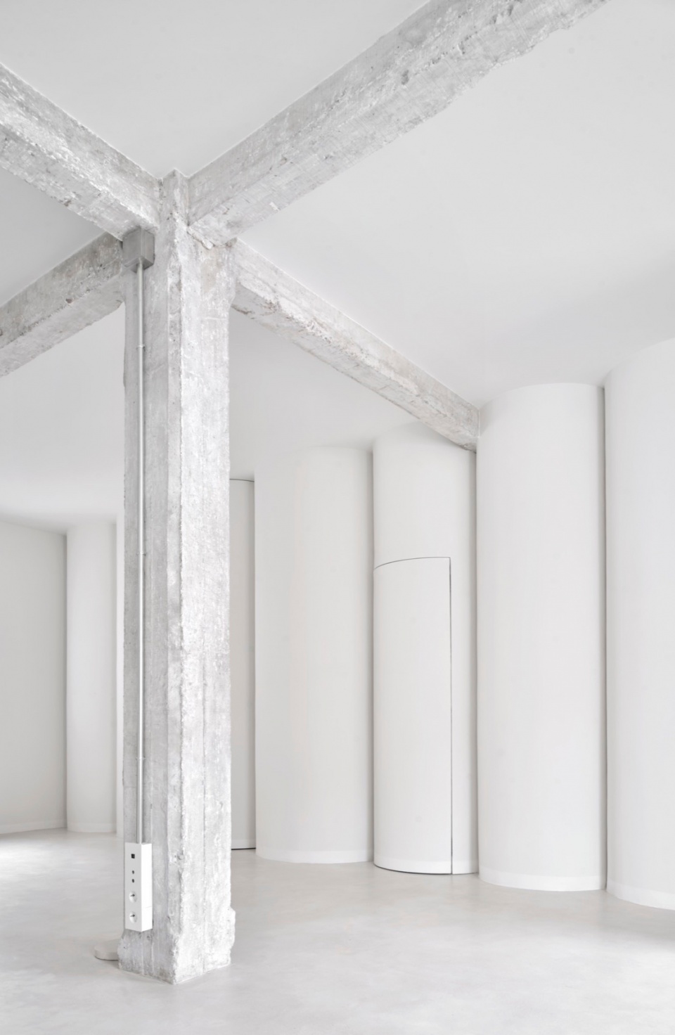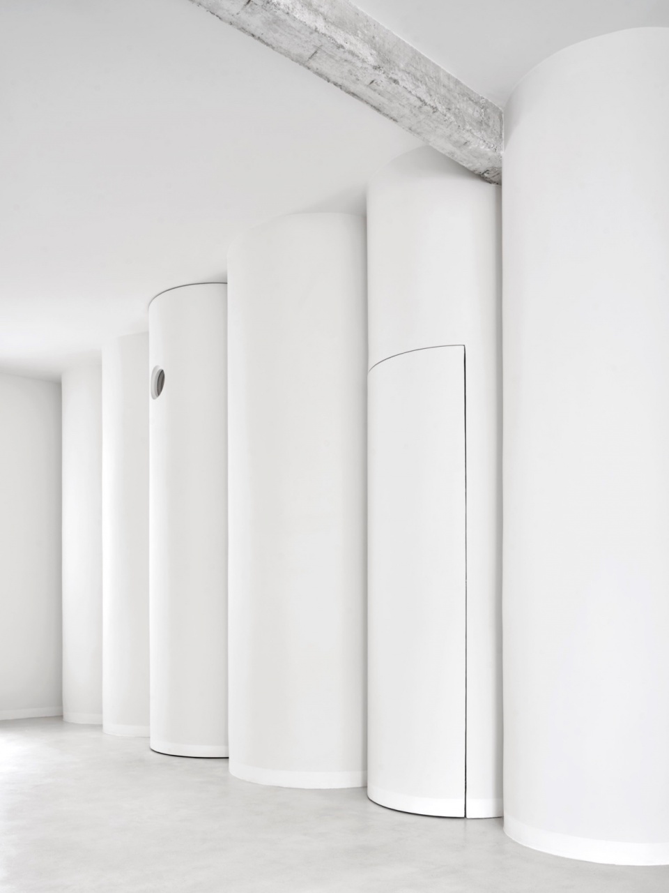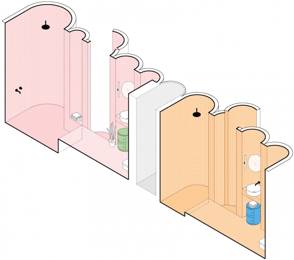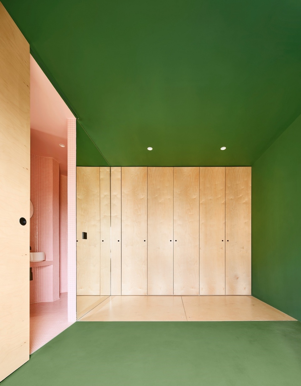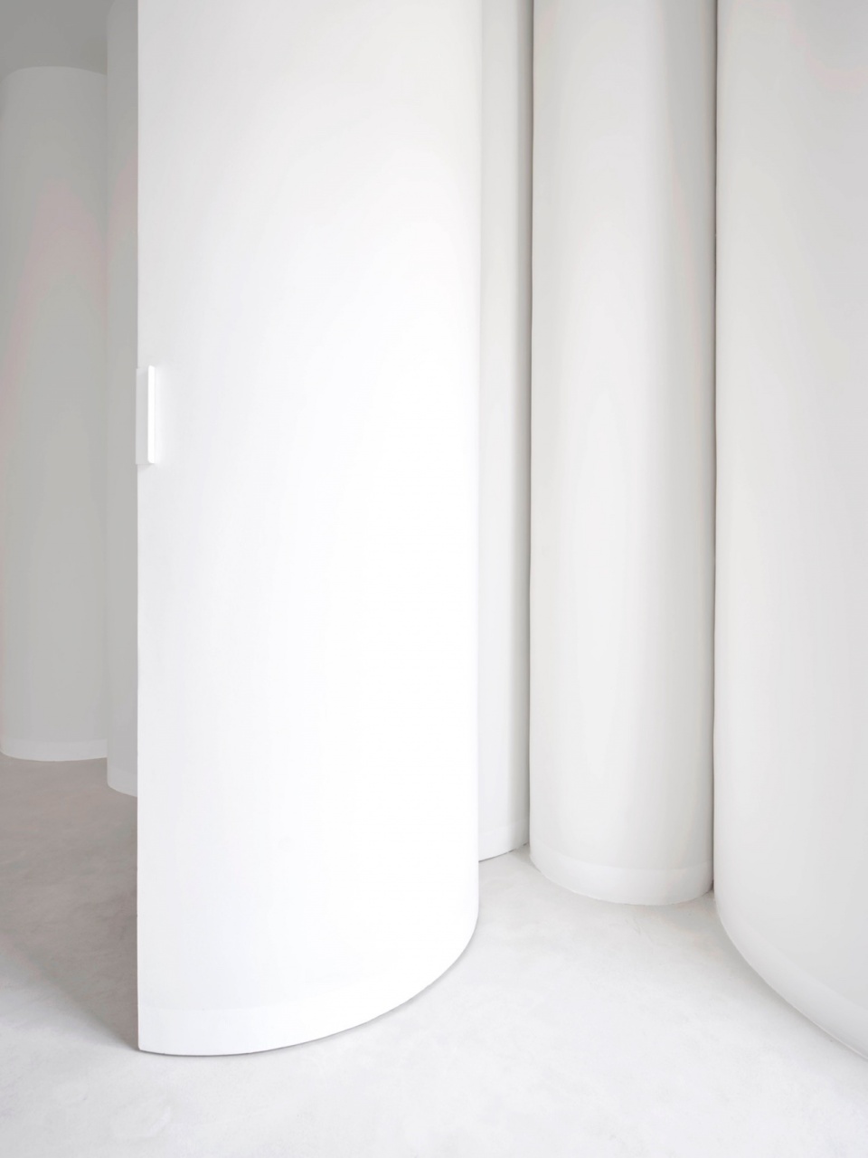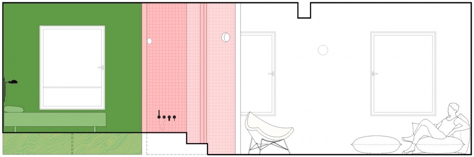 在公共空间与私密空间之间,一条狭长的“板块”作为过滤器,容纳了住宅的湿区。仿佛是一种仪式,从最私密的空间穿越这一湿润的“云”后,才能进入公共区域。早晨,你在自己的私密空间中醒来,穿过这片“云”去清洁自己、准备开始一天并走向公共生活。