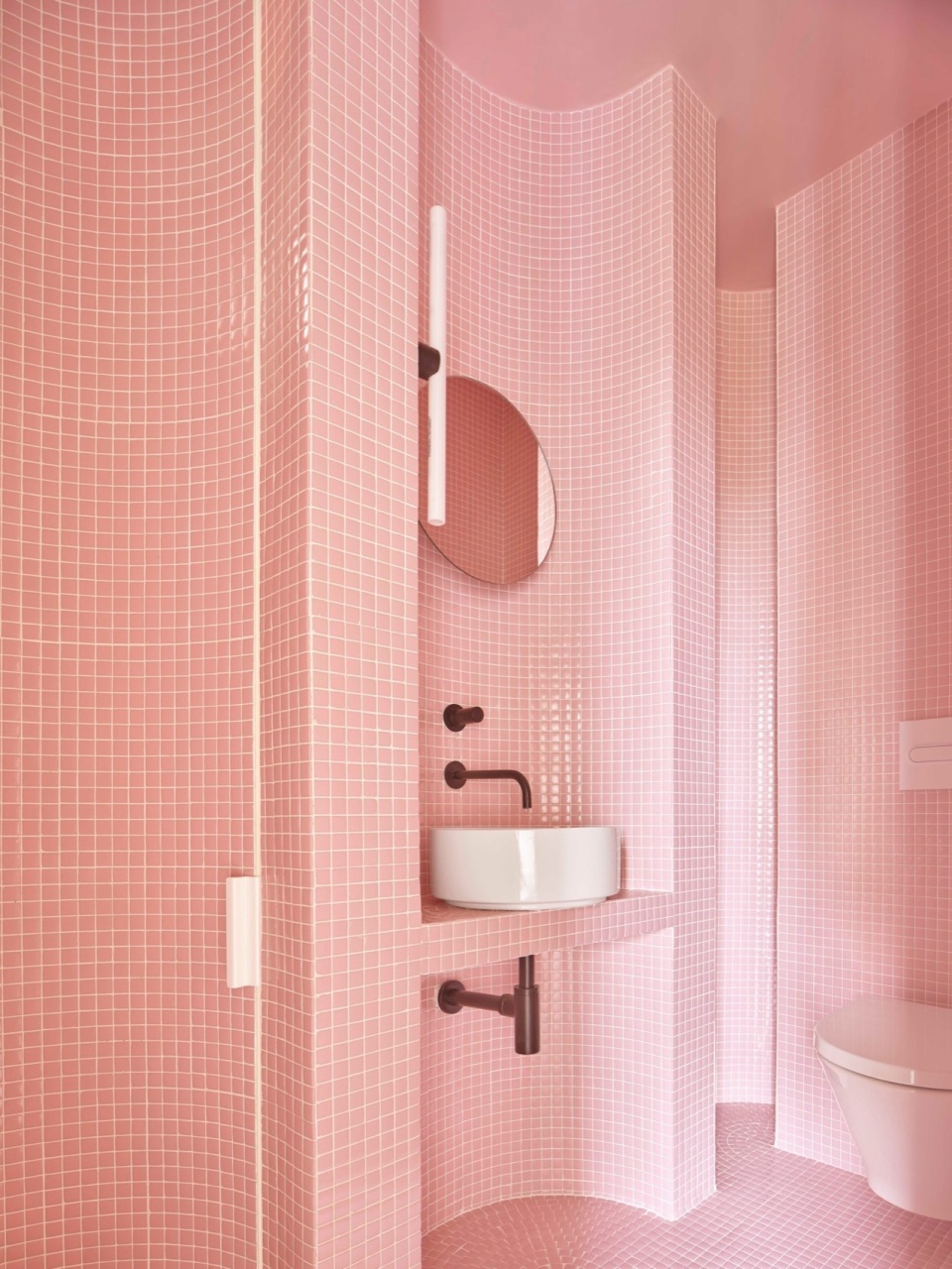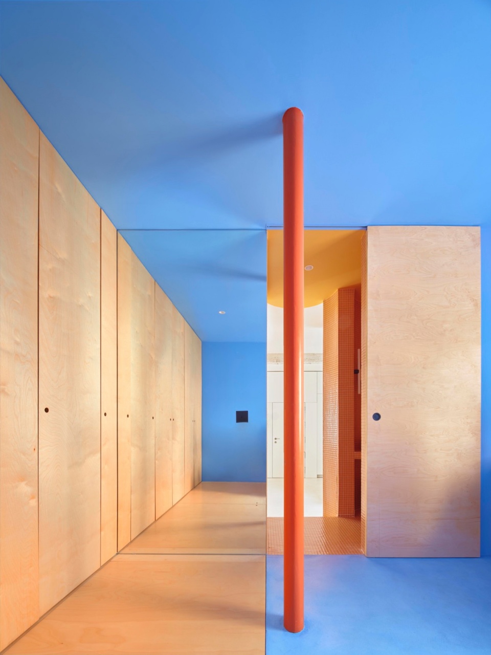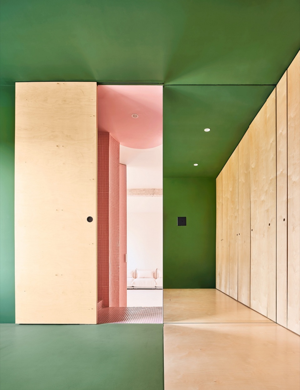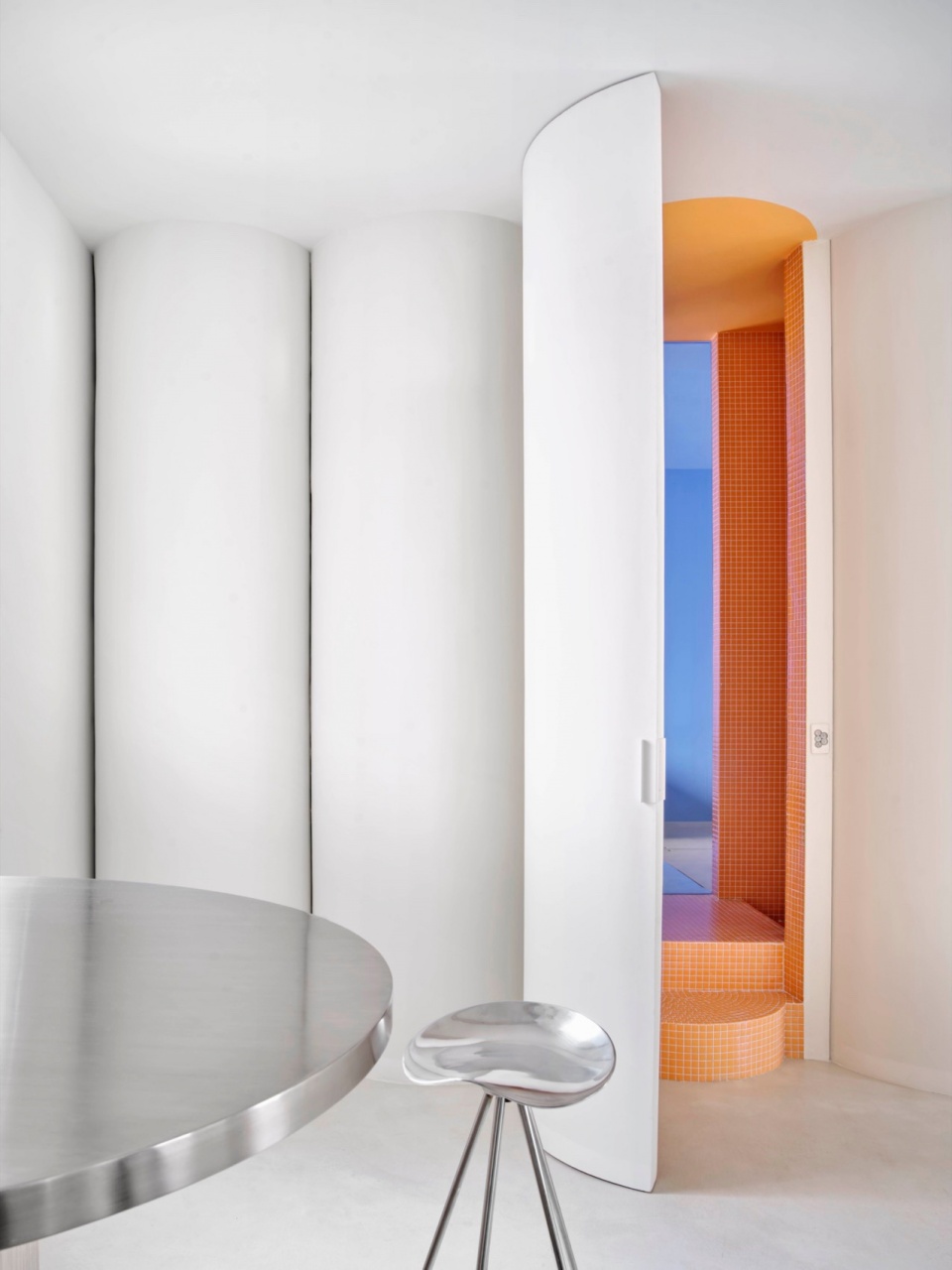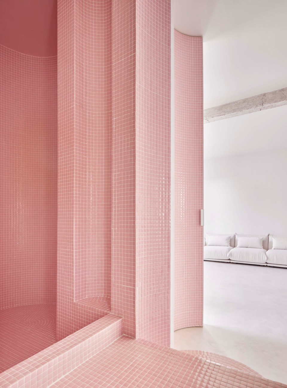 This ‘cloud’ is elevated with respect to the ground level of the home to allow the passage of the facilities to the main downspout, but also to reinforce the transition from the public space, open and white, with a free height of 3 meters, to the private space. . , colored and collected. Two large hidden curved doors give way to these rooms. All the interior surfaces of this ‘filter space’ are covered in vitrified ceramic, as if it were a single skin. They are finished in a glass mosaic of 2.5 x 2.5 cm pieces from the Hisbalit brand, installed on the curved walls using preformed meshes, and on the floor in an artisanal way, piece by piece aligned with the curve where they meet. . with the walls in concentric circles.