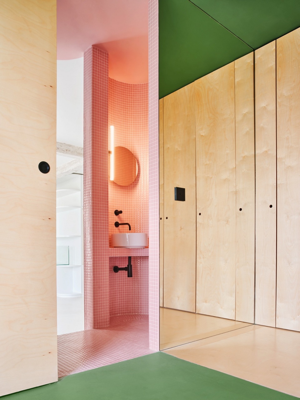 这一“云”相对于住宅地面略有抬高,以便设施管线通向主立管,同时强化了从公共空间——开放明亮、净高三米——向私密空间——色彩丰富、紧凑收拢——的过渡。两扇大型隐藏弧形门通向这些卧室。这个“过滤空间”的所有内部表面均采用釉面陶瓷覆盖,仿佛一体化的外皮。墙面采用Hisbalit品牌2.5×2.5厘米的玻璃马赛克,通过预制网格铺设在弧形墙面上,地面则以手工方式逐块铺设,沿曲线排列,与墙面呈同心圆交接。