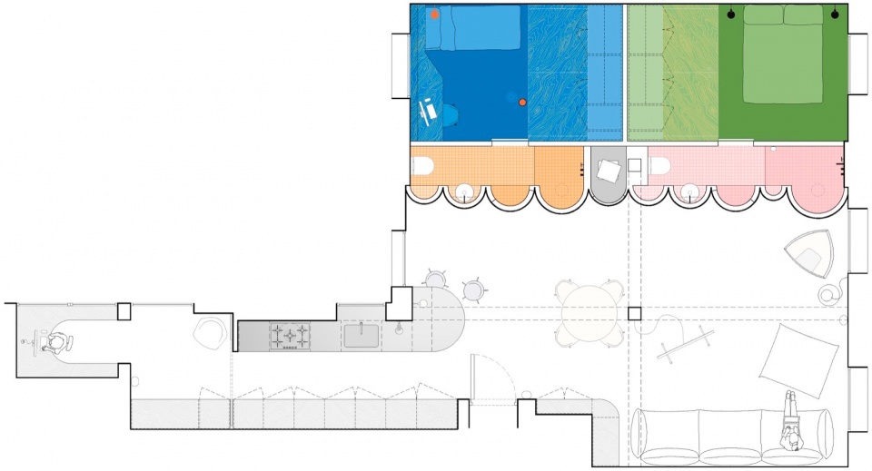 一方面,设计提出了一个容纳住宅所有公共功能的大空间,并将这些功能组织在一个统一的明亮白色房间中:客厅、餐厅、厨房、阅读区……这也使该空间能够实现自然通风,并充分利用自然采光。空间面向外立面和社区庭院,大幅提升了舒适度。紧邻这一公共区域的是私密的“堡垒”,由两间对称的卧室组成,一间面向主立面,另一间面向内部庭院。不同于中性白色的公共空间,每间卧室都完全被其居住者选择的颜色所浸润。