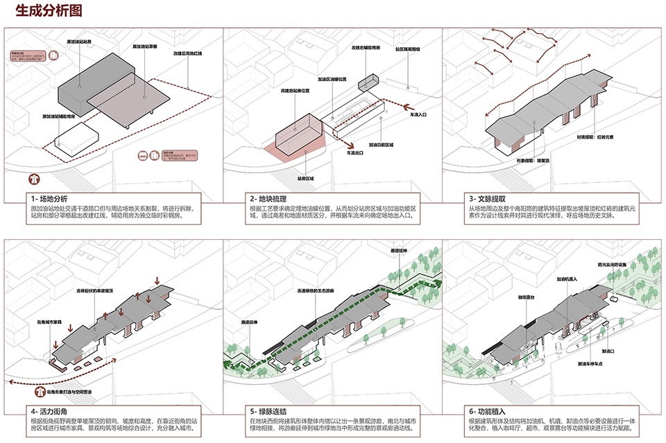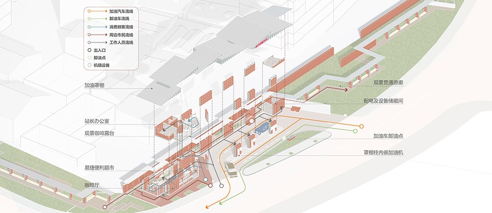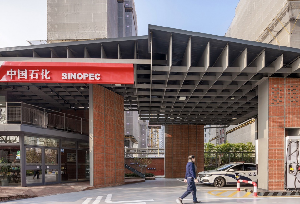 本项目提出着力消除“邻避效应”,以积极的姿态融入街区及城市,提出了“城市链接+文化演绎+功能复合”的设计策略,力求打造“服务设施+展览游廊+里弄记忆”三位一体的城市“人+车生活驿站”,将加油站、城市驿站等功能紧密融合。以现代结构演绎的坡屋顶和红砖材质呼应在地文化,以转角咖啡厅融入城市生活,以建筑退让出的公共通廊贯通城市机能,形成特色明确、功能复合的“城市基础设施复合体”。
