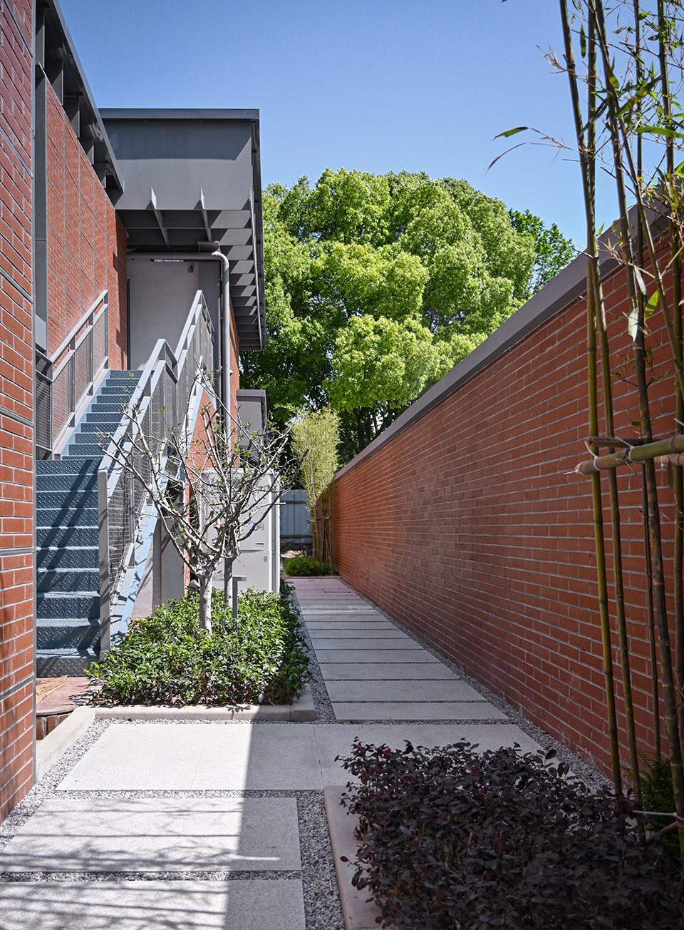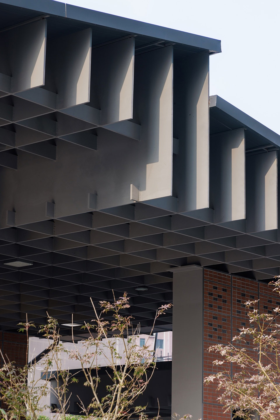 Most striking, the “load-bearing walls” are not made of brick or cast-in-place concrete. Their structure is homogenous with the steel-framed pitched roof—both are built using steel plate grid systems. Red bricks are laid within the steel frames, creating a contrast between the precision, modernity, and lightness of steel and the rustic, natural, and solid qualities of brick. This adds layers of sensory experience to the “load-bearing walls,” evoking a sense of familiar strangeness.