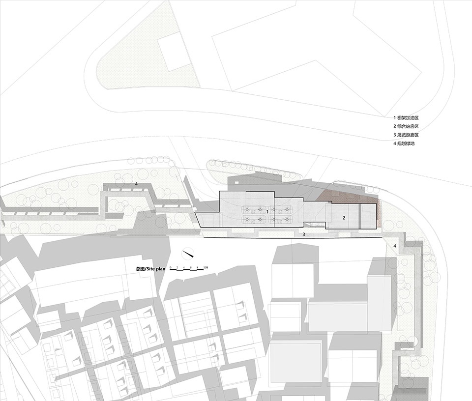 胜利加油站项目处在一个更宏观的城市更新的背景之中。由于道路拓宽城市发展等要求,原有的加油站的用地面积被缩减,该地块用地又刚好处于区域发展轴线之上,周边地块的功能以住宅和办公为主,难免对于加油站的建筑产生一定的“邻避效应”。这些都给加油站设计带来了更多的机遇、给加油站这一类型承载的意义提出了更多要求:如何更集约的布局、如何完成轴线延续的定位、如何进行适度的文化表达与周围环境的链接以及功能的适度创新。