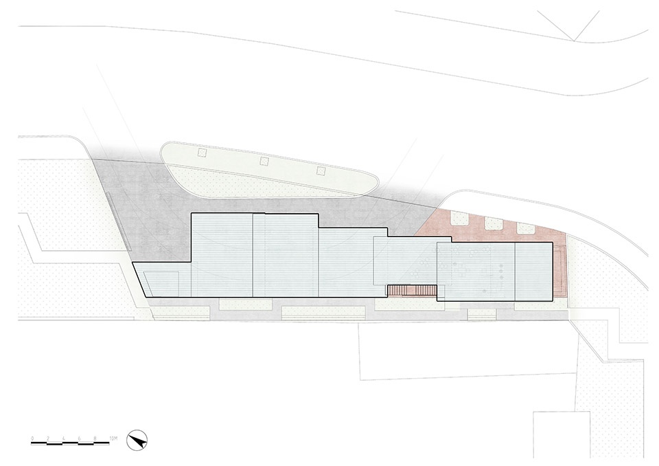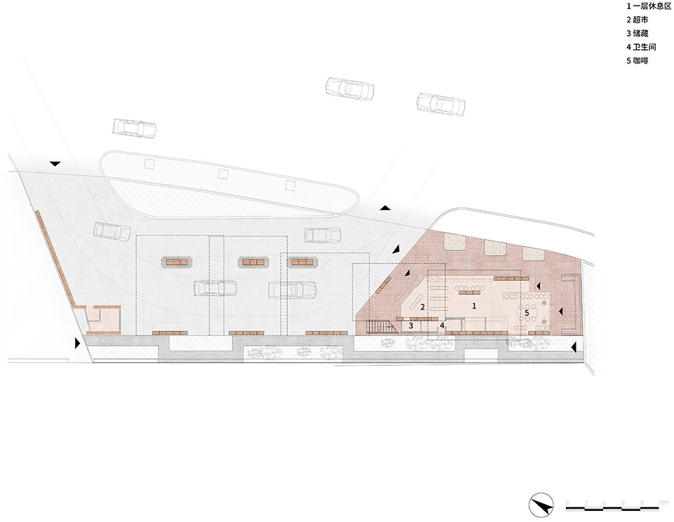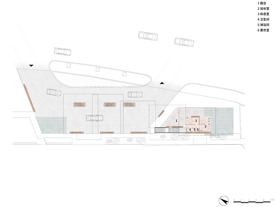 站房的面积十分有限,但项目仍然实现了功能复合,一层的超市和咖啡厅共用街角通透站房区域,毗邻“文化通廊”的钢楼梯对外开放,人们可以到露台观赏景观。场地铺装利用红砖形成一个“红砖岛”,将公共区域做一个柔性空间限定,形成一个可以外摆的空间外延。