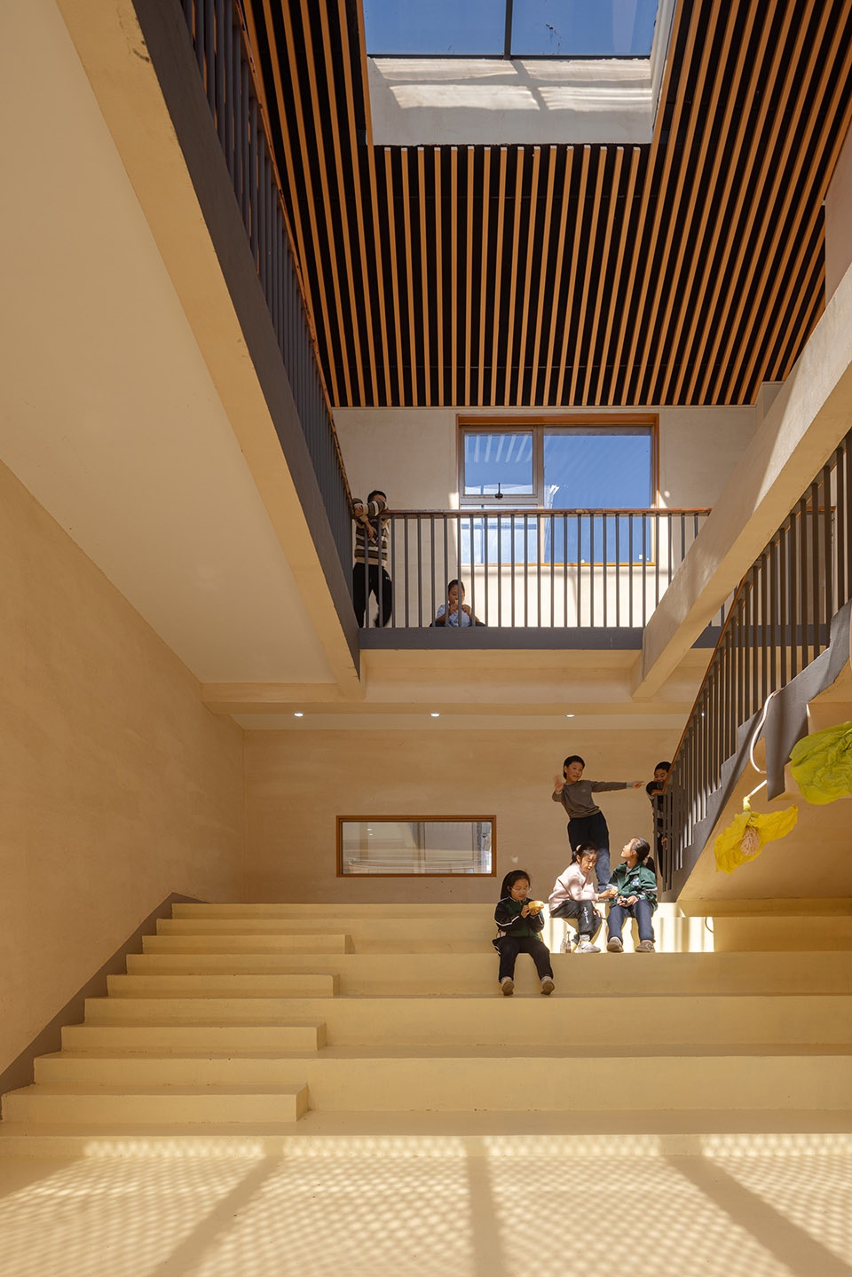 每一组教室都以“独立而开放”的方式布置,既适合集体协作,也鼓励个体沉思。教室之间的灰空间、廊道和平台也被设计为可教可学的弹性空间,教学活动可以自然延伸至室外。