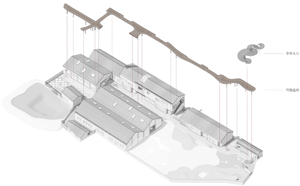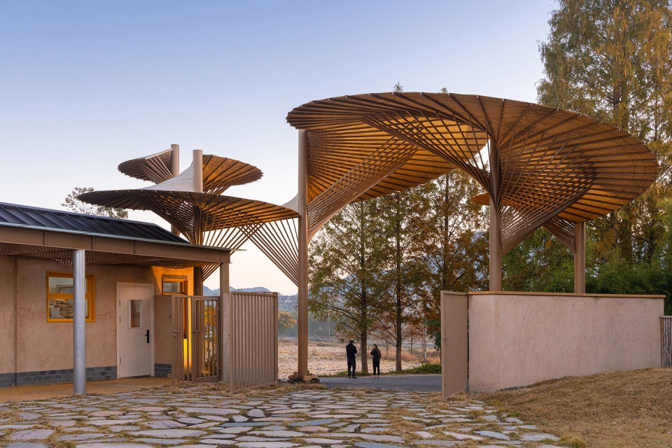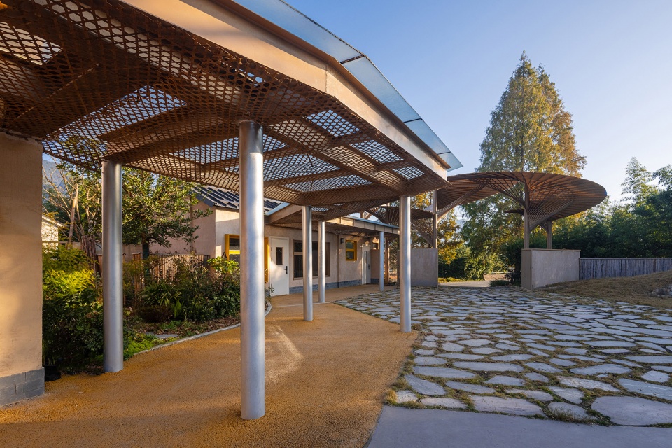 校门入口空间以传统油纸伞为灵感,融合现代参数化设计方法,成为连接学校与社区的“第三空间”。廊道与雨棚既具有气候适应性,也成为儿童流动与停留的学习背景。建造过程不仅是物理操作,也成为一次社区参与与知识交流的过程。设计团队希望通过这种有温度的空间生产方式,使建筑本身成为文化再生与乡村社会机制重构的一部分。