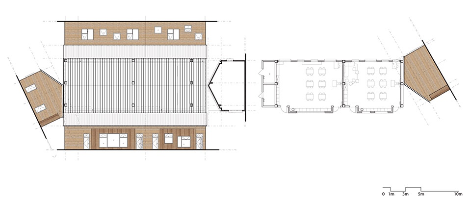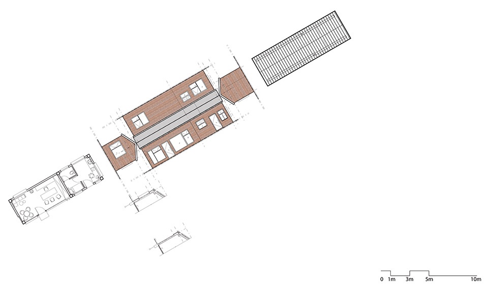 我们尊重原有校园的基本布局与场地逻辑,在原址基础上以轻介入方式进行重构,保留了双坡屋顶和原始体量,同时通过模块化布局与廊道组织,形成一个开放而灵动的教学聚落。建筑不再是封闭的教室,而是贯穿于田野、树荫与溪边的多个学习节点。学习的场所不再只有一间“教室”,而是由“走廊、操场、平台、庭院”等多个空间共同构成。我们希望让学习像野草一样,自然地在各个角落生长,与环境、季节、人群产生真实联系。