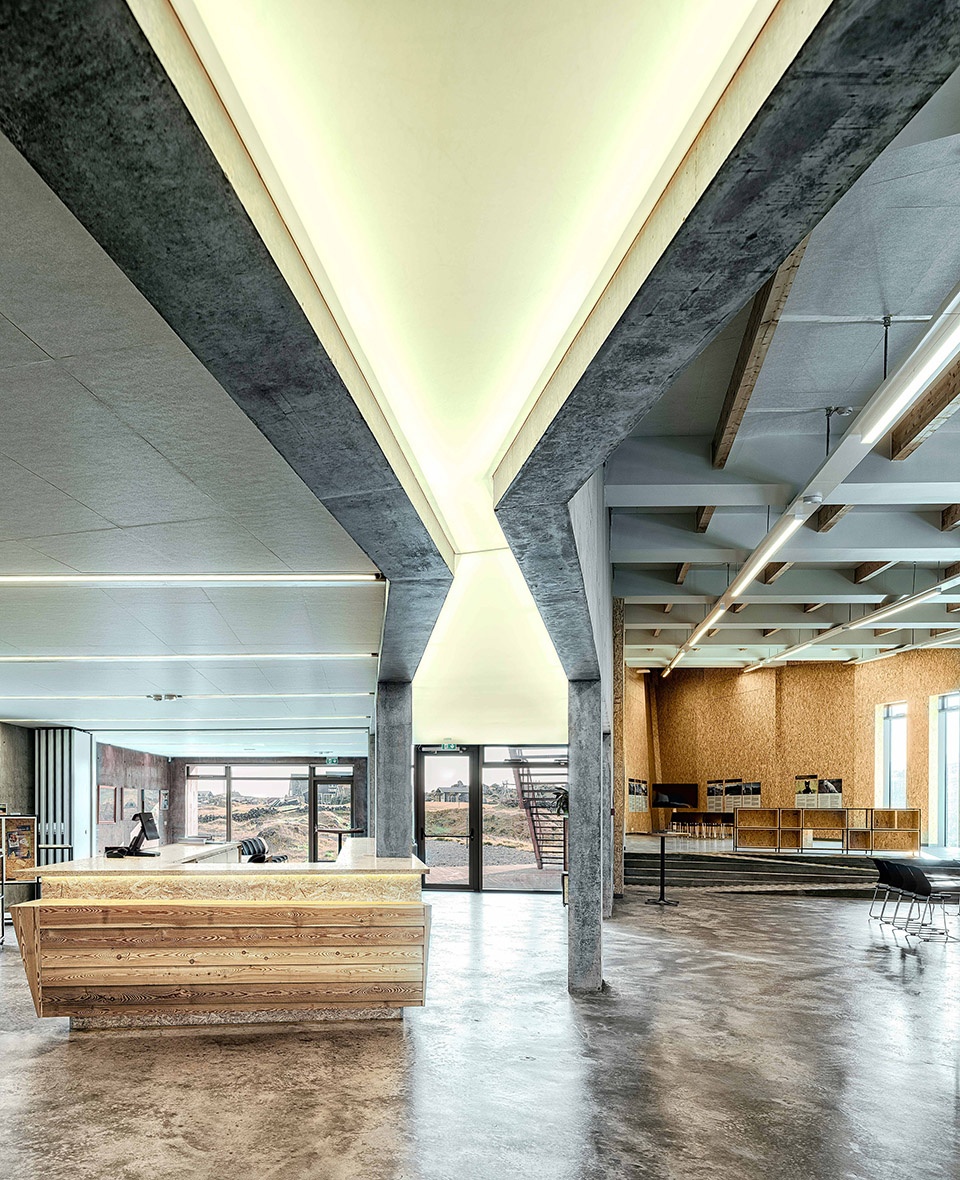 设计概念分为两个部分:“冰川之角”与“鱼骨”。前者为国家公园工作人员的办公设施,后者则容纳展览空间、咖啡厅与讲座区。外立面采用两种不同的木材饰面:“冰川之角”部分为水平木板覆面,“鱼骨”部分则为垂直木板覆面。
