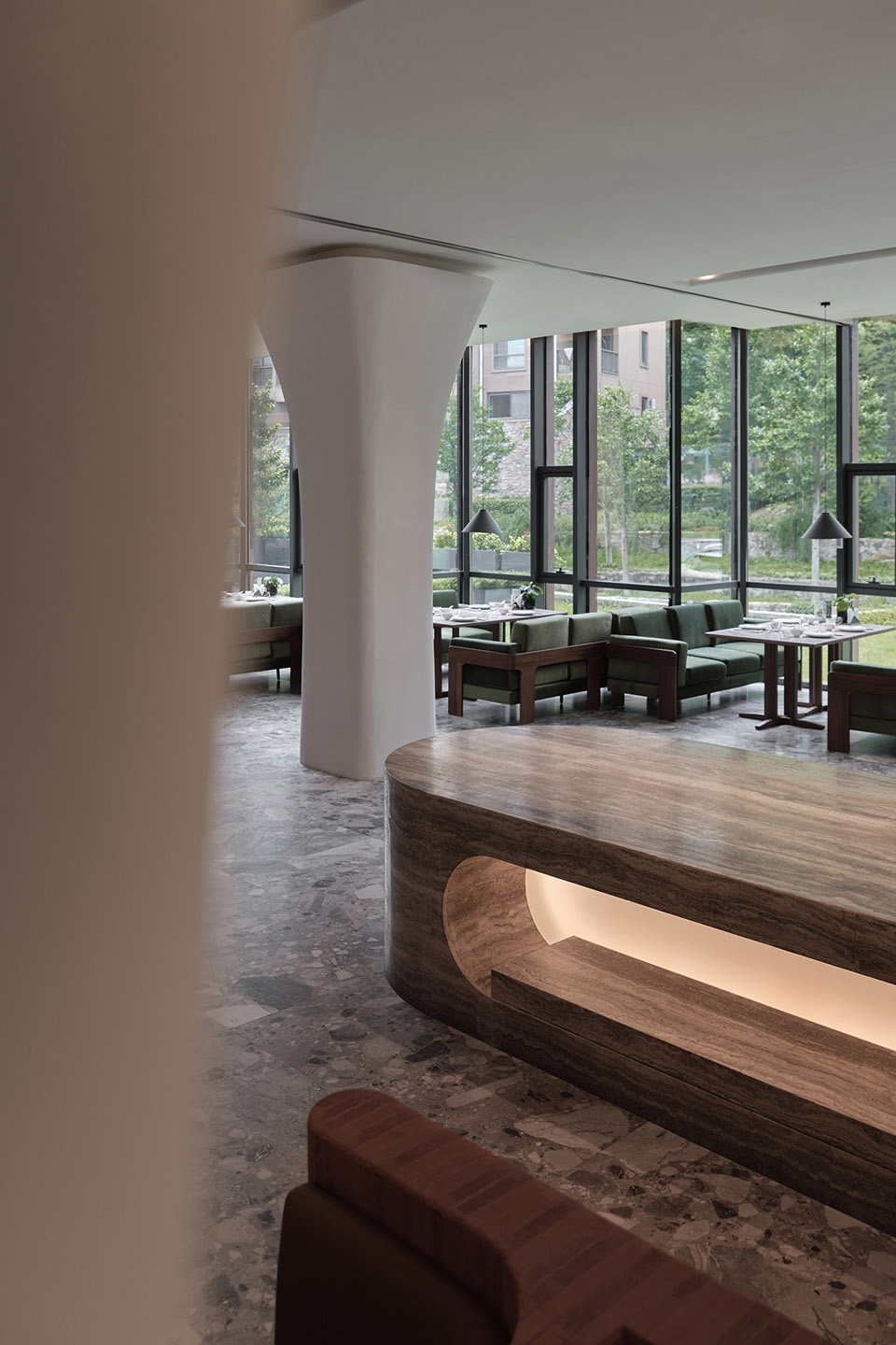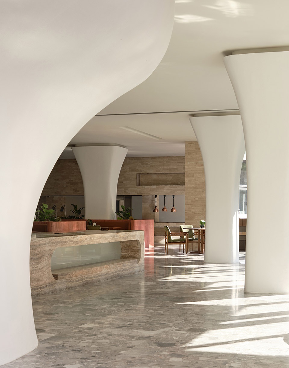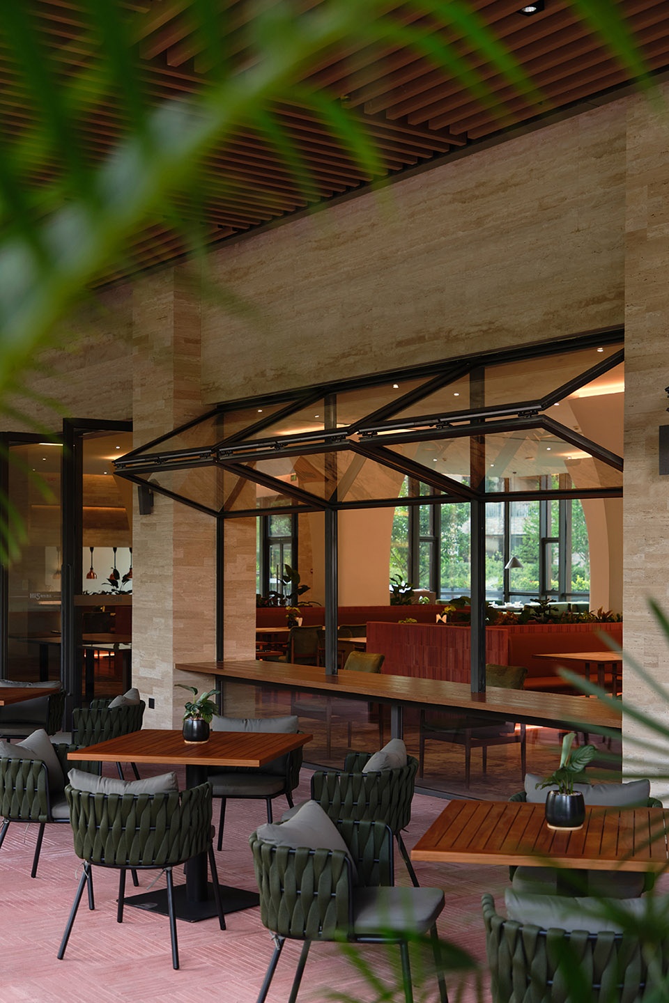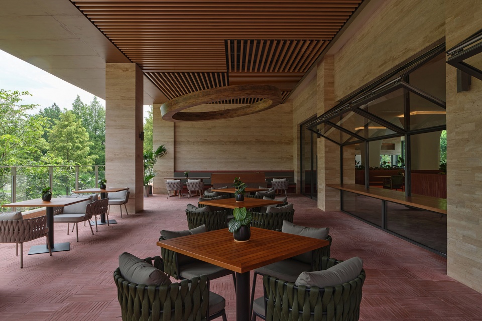 Stepping into the restaurant, the natural vocabulary is further extended. Travertine, red brick, and marble set the primary visual tone, while the interweaving of greenery evokes a softer connection between people and nature.