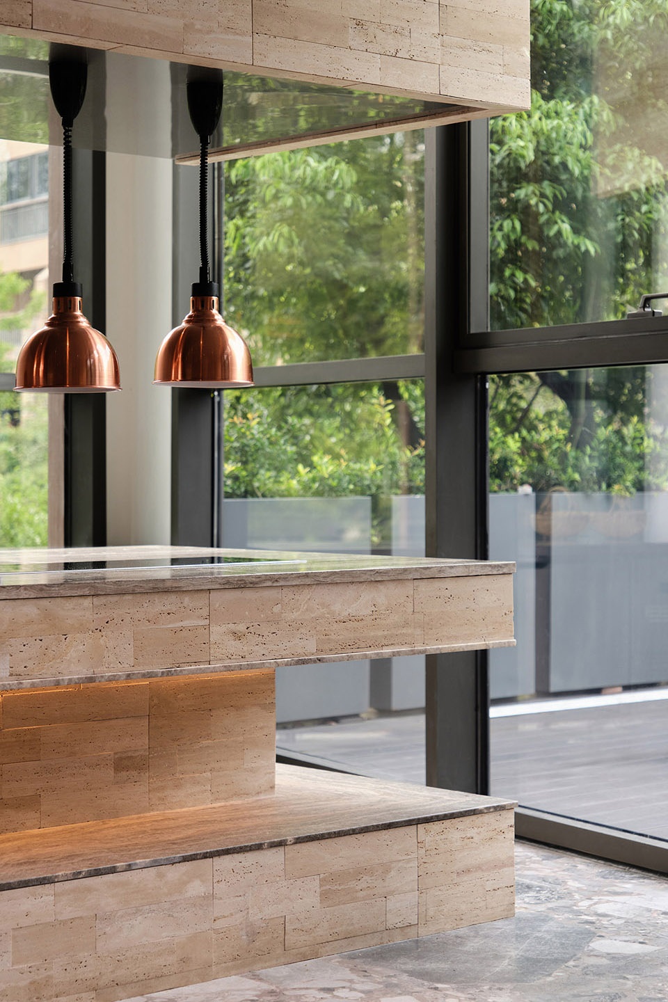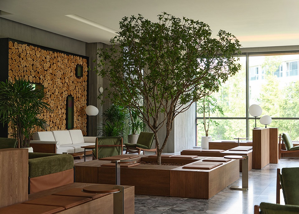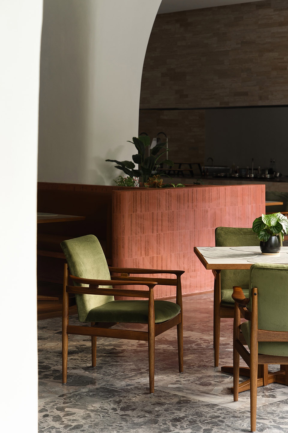 Stepping into the restaurant, the natural vocabulary is further extended. Travertine, red brick, and marble set the primary visual tone, while the interweaving of greenery evokes a softer connection between people and nature.