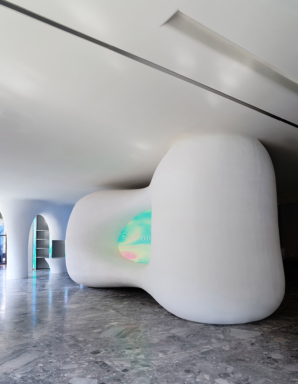我们为装置设定了一组动态影像,在嵌入式动态屏幕中流动,如能量源,以绚丽而克制的律动,引导空间的情绪,也成为品牌语境下的第一触点。