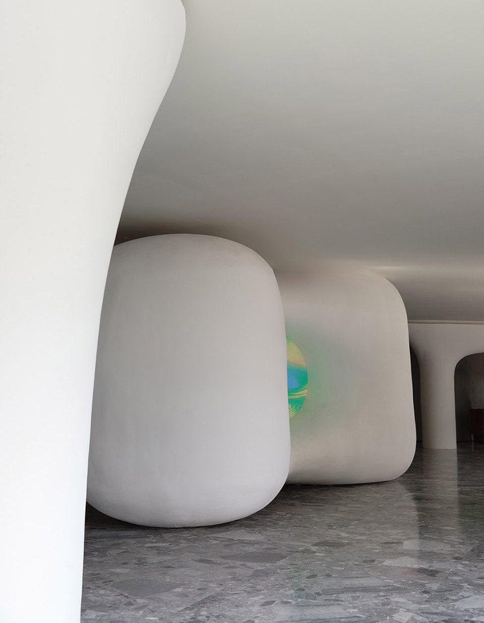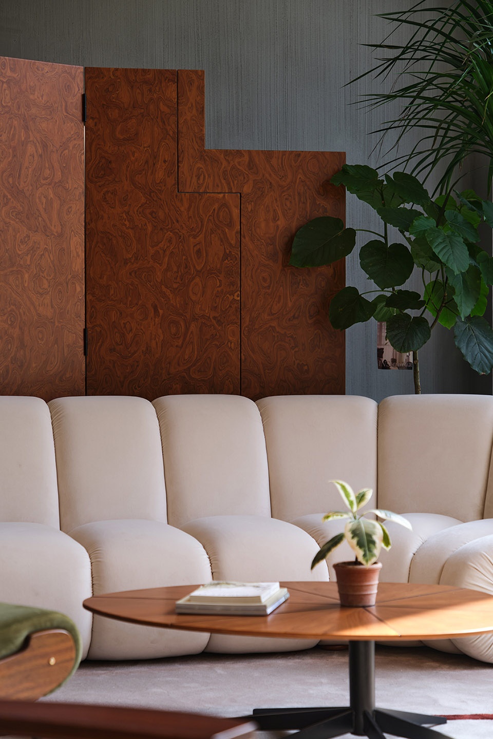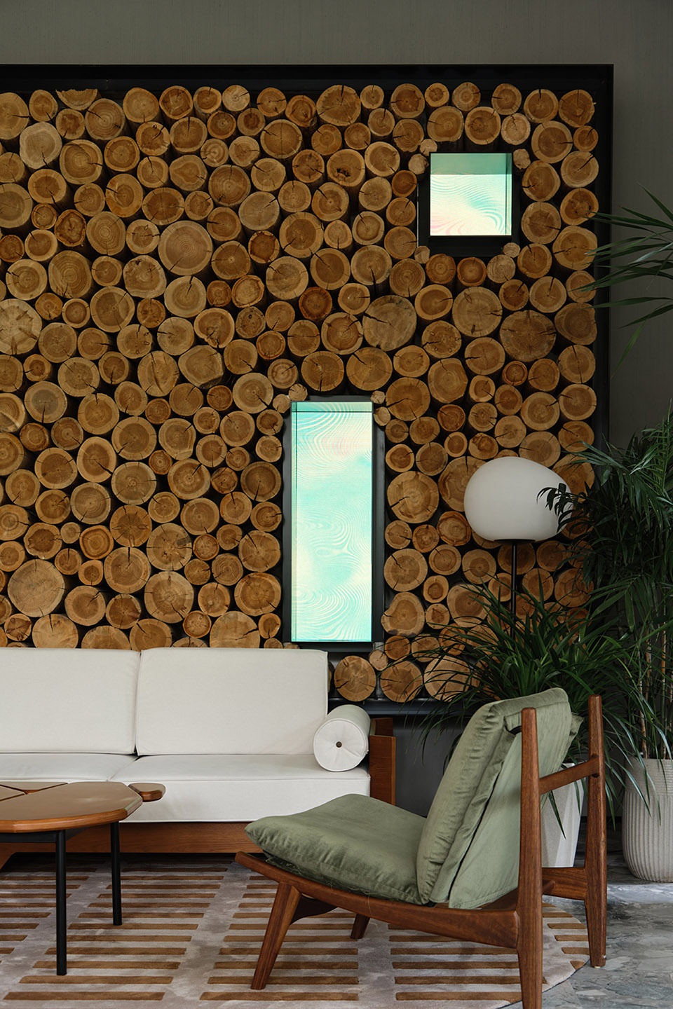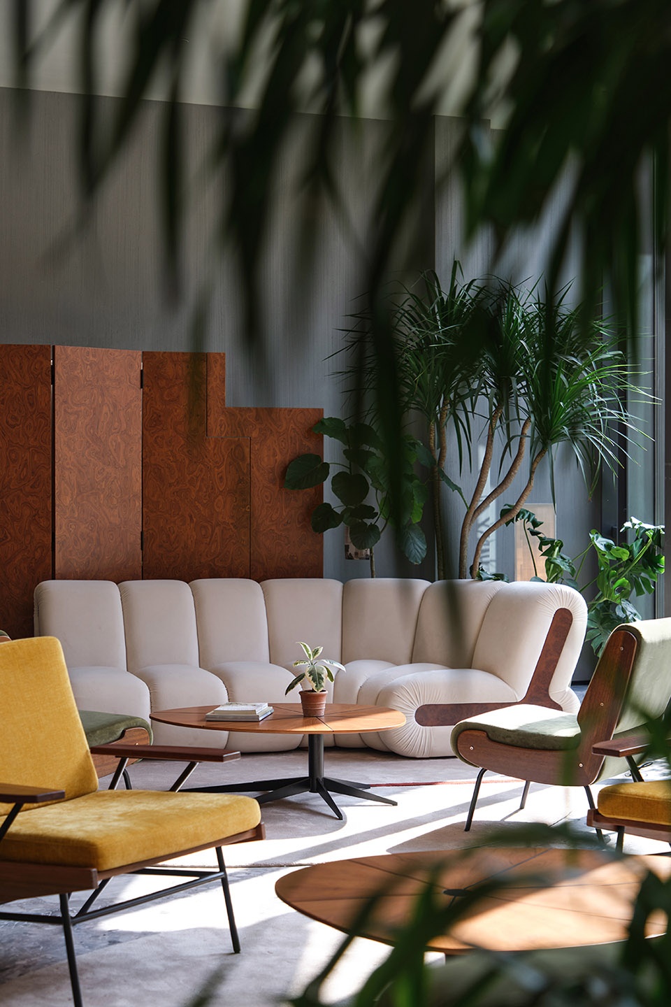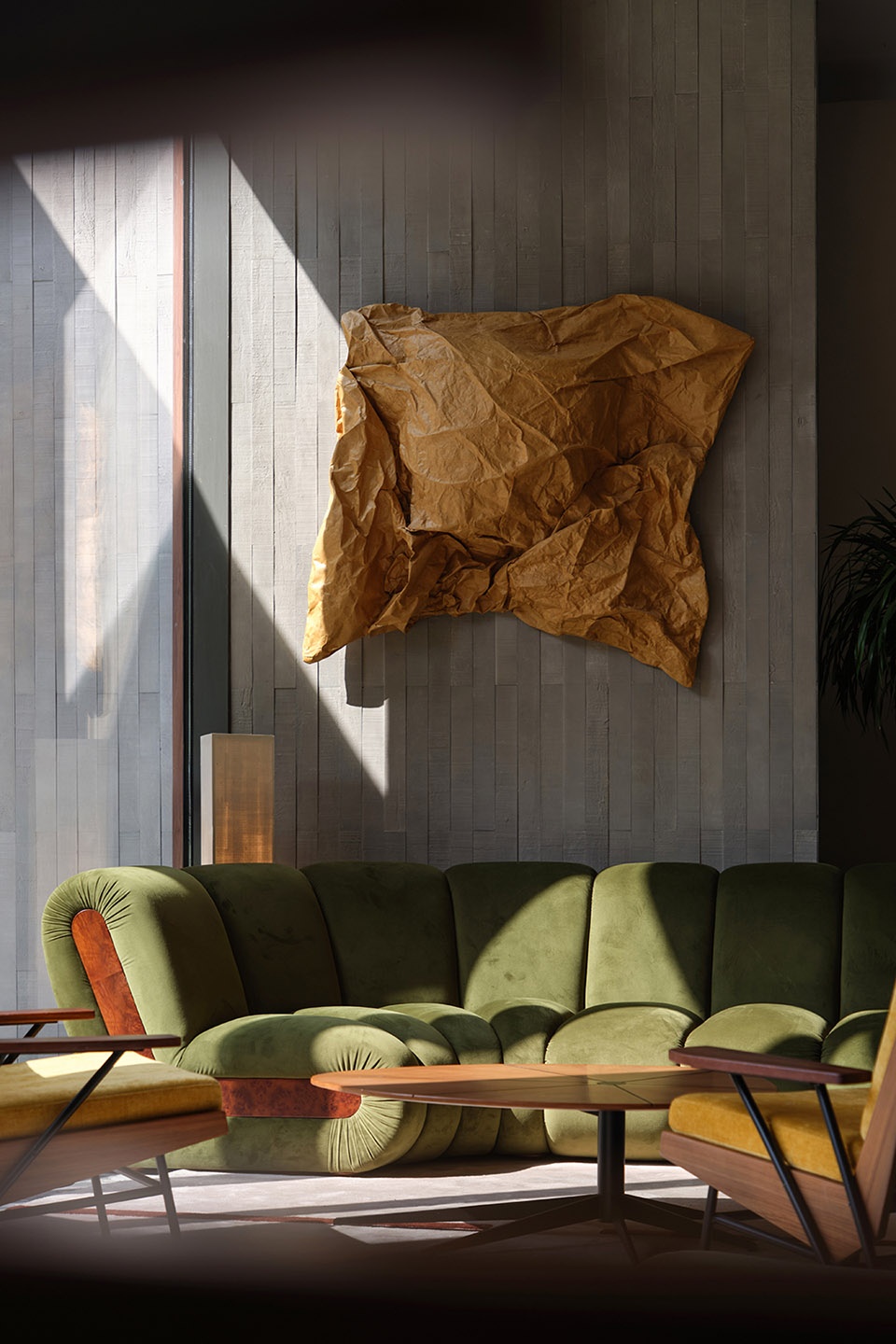 An off-white, cloudlike sofa blurs the boundaries of its form, enveloping the body with a softness reminiscent of mountain mist. Green and ochre armchairs appear as though gathered from the forest and sunlight, while the coffee table