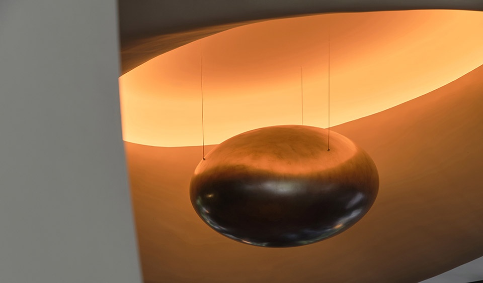 ▼一颗金属球体悬浮于光晕之中,a metallic sphere hovers within a halo of light