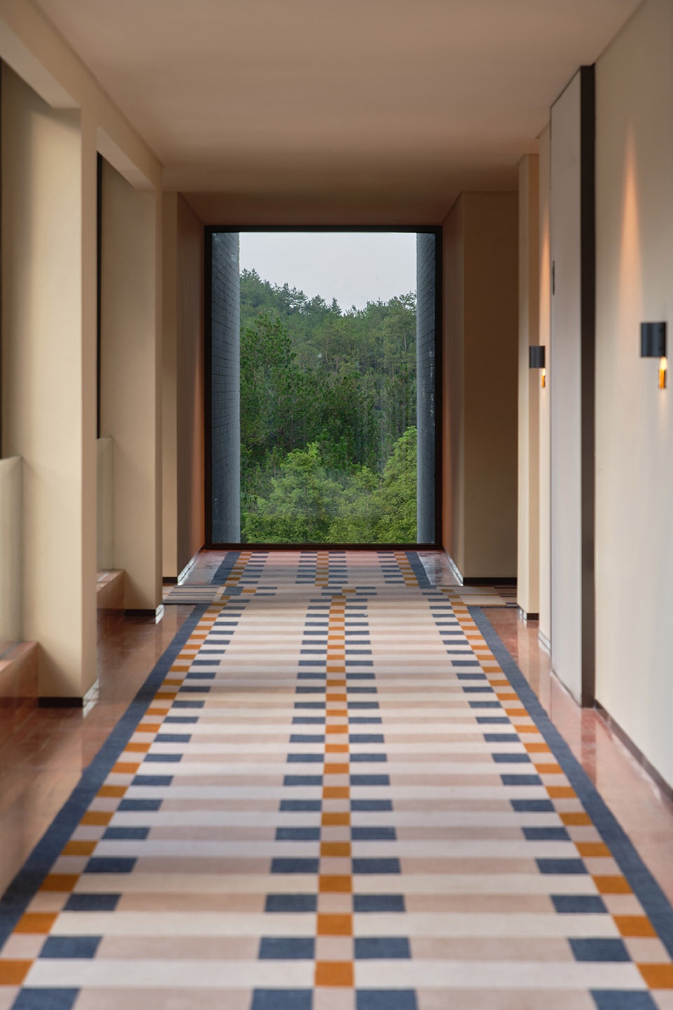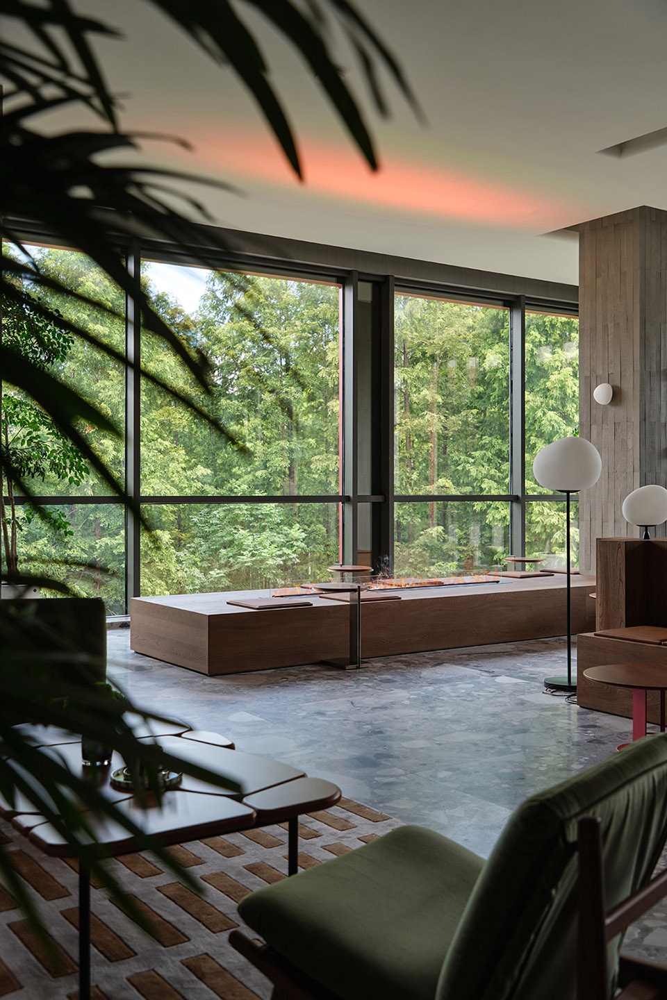 The hotel lobby floor is paved with natural stone, preserving its original texture and tactile quality—like the gravel paths one treads while walking through the forest.