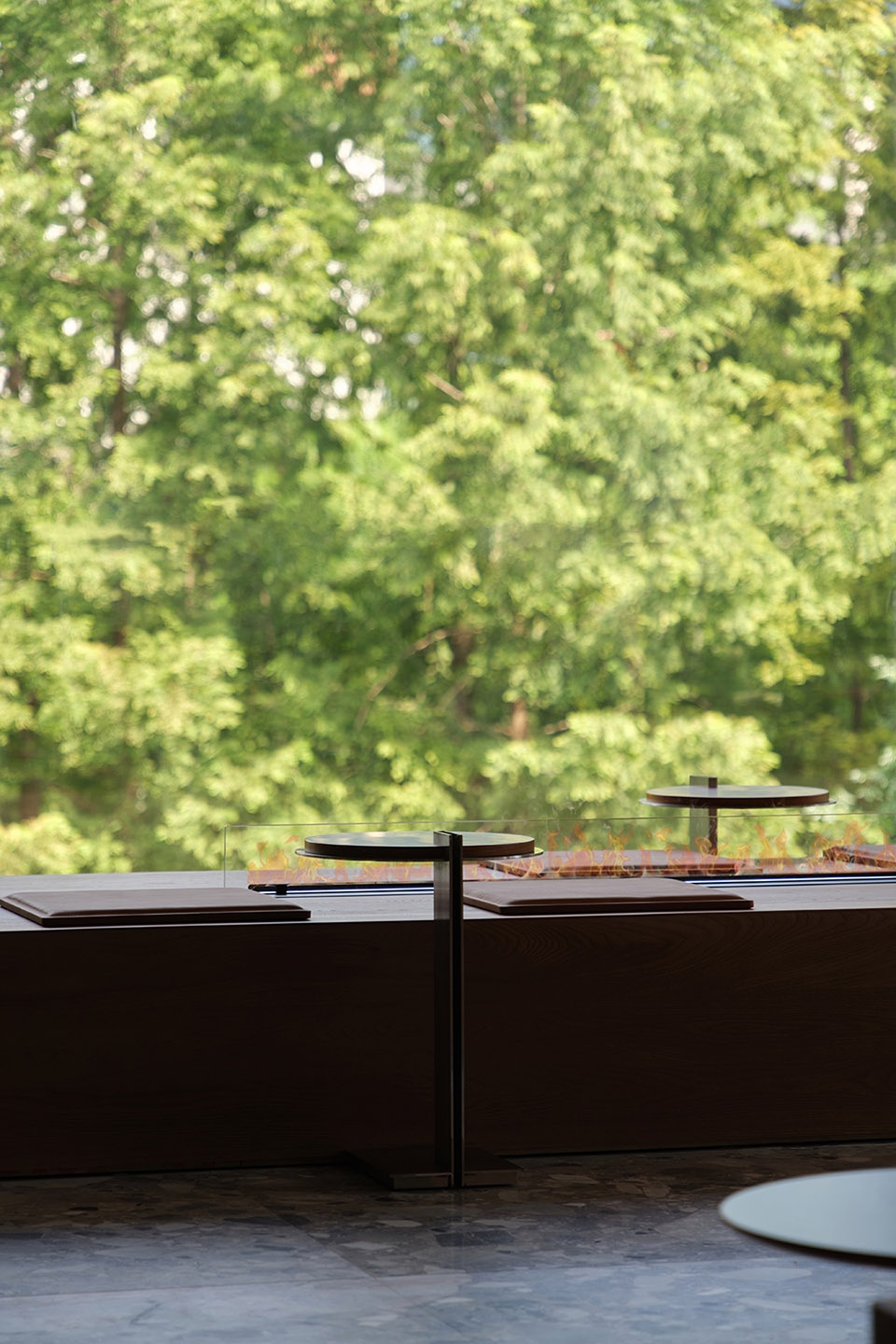 surrounded by greenery during the day, and in the evening, defined by a real-fire fireplace and timber-enclosed