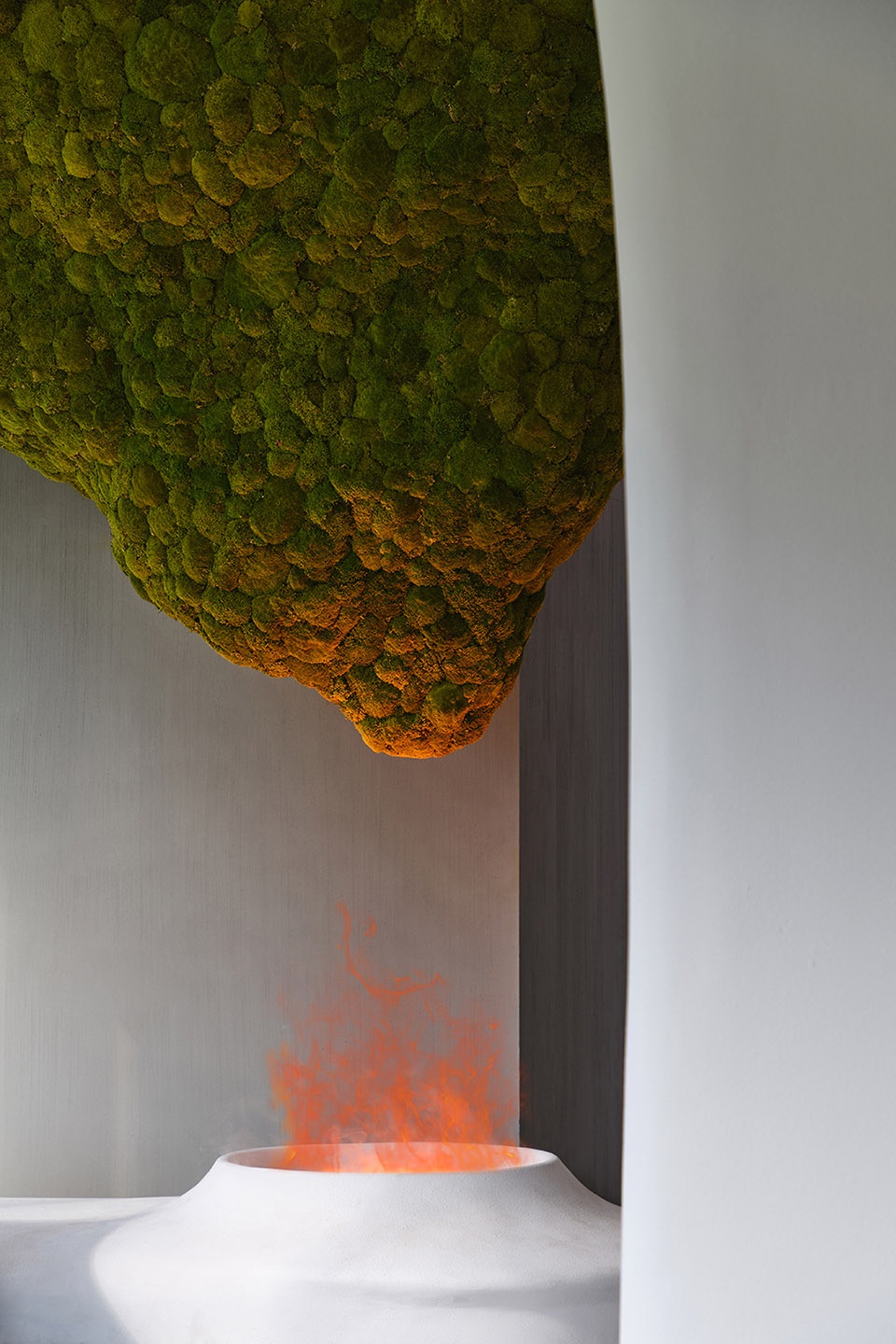 In the transitional space leading to the ADD restaurant, we placed a fireplace installation where flames gently flicker between wood and stone, radiating an inward warmth. Suspended above, the “Floating Mountains” appear light and tranquil—at once cloud-like and mountain-like—embodying a vitality shaped by the passage of time. Reflected by the firelight, they create an emotional buffer along the path, guiding guests into the dining space.