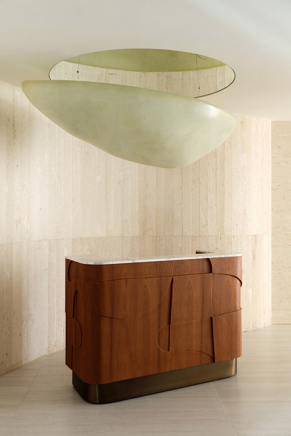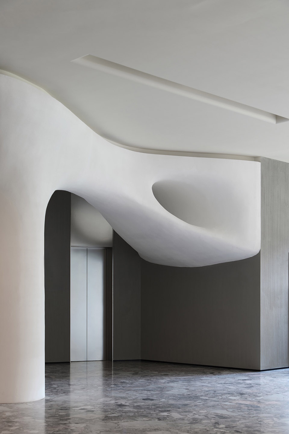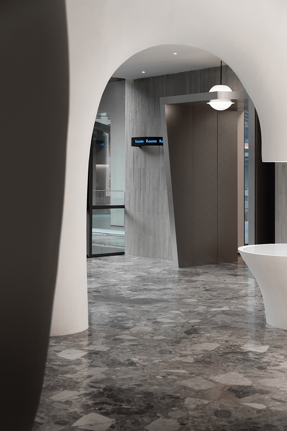 On the left side, the pop-up zone functions not only as an artistic display but also as an interface for conveying daily updates such as weather, time, and information. It additionally supports retail activities. Vertical light columns define the rhythm of the wall, creating a facade composition with a sense of breath. Above the reception desk, a metallic sphere hovers within a halo of light, forming the visual focal point of the space. Though motionless, it is charged with tension—like a suspended moment frozen in midair, where movement and weightlessness find their equilibrium.