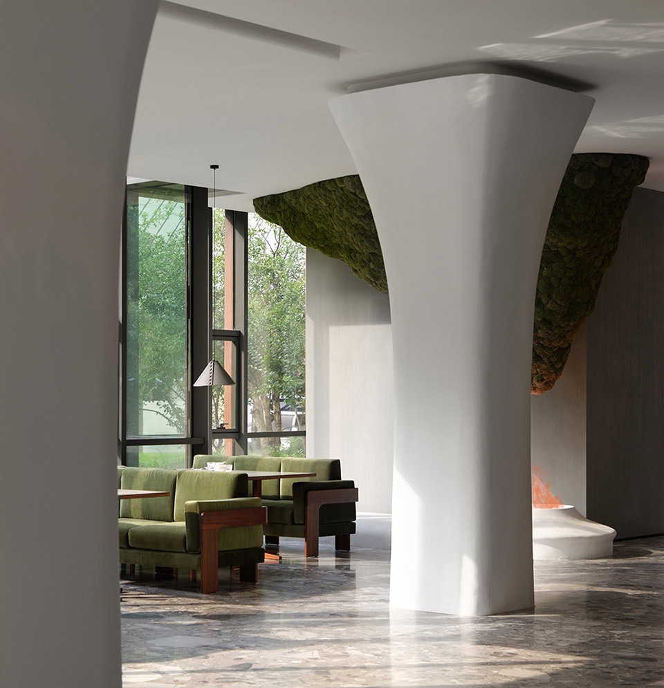 With dynamism at its core, the lounge area does not directly imitate the gestures of movement. Instead, it translates them through structural tension and material texture into a spatial state of natural flow and organic growth. An implicit force shapes the rhythm, so that every step feels like entering the gentle breath of the wilderness.
