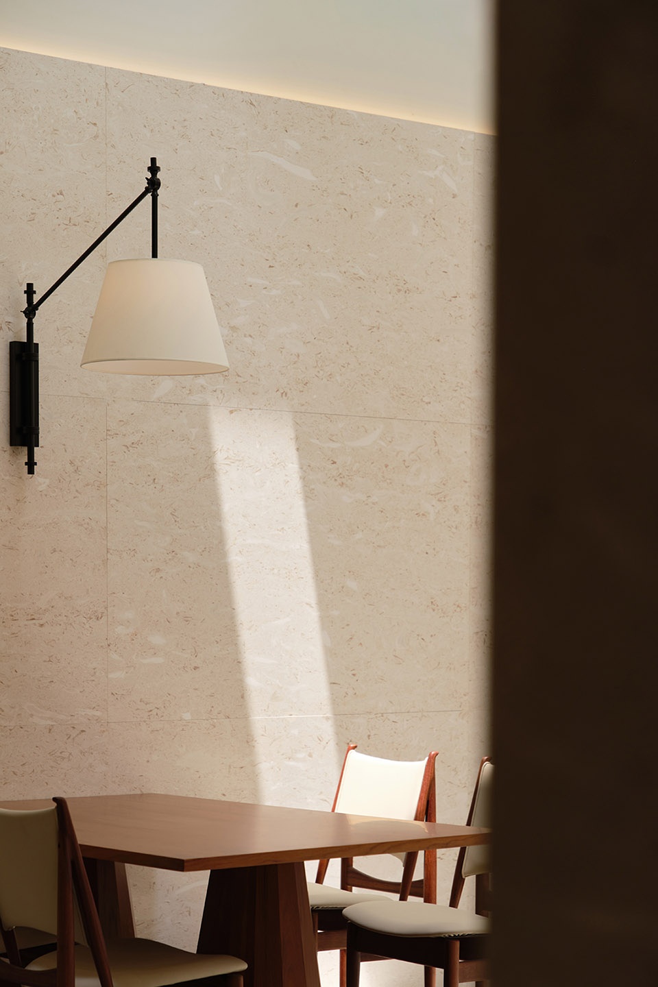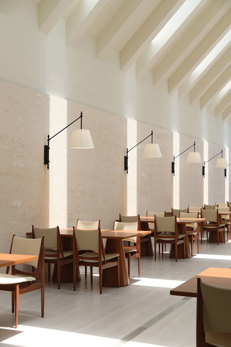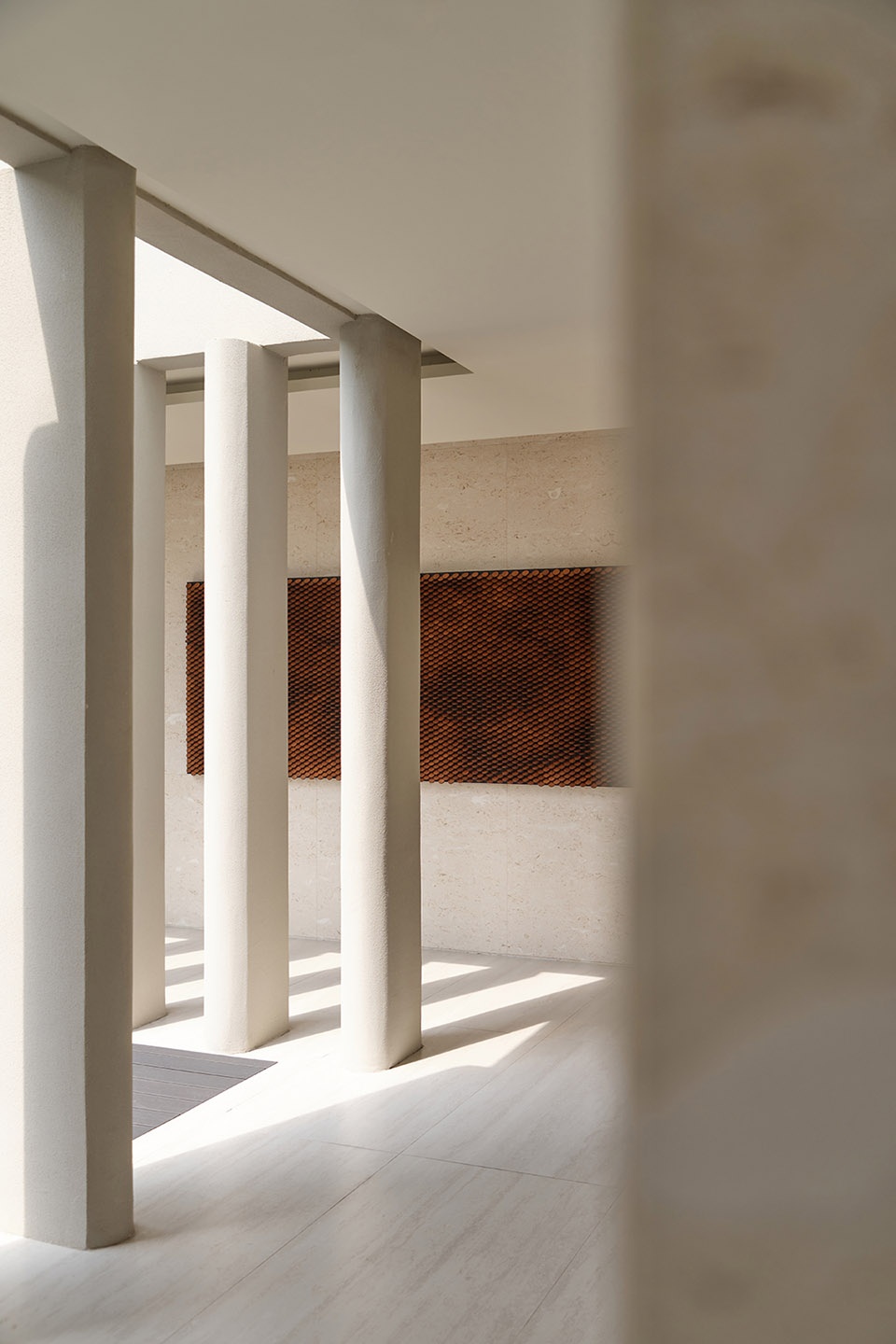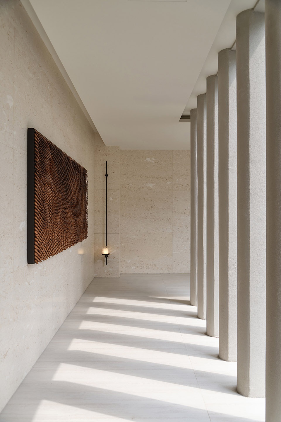 Stepping into the third-floor Chinese restaurant, the rhythm shifts once again. The overall space is set against a pure white backdrop, where minimalism evokes a solemn, chapel-like atmosphere. White stone defines the primary visual framework, while orderly rows of columns create a sense of layered procession. Natural light pours in through façade openings, reinforcing the order and depth of light and shadow, imbuing the tranquil space with both warmth and fluidity. At the entrance, a custom art installation echoes the overall atmosphere, while suspended lighting fixtures cast their glow downward, weaving through the columns and stone surfaces. The interplay of illumination traces gentle shifts between light and shadow, further enhancing the spiritual quality of the space.