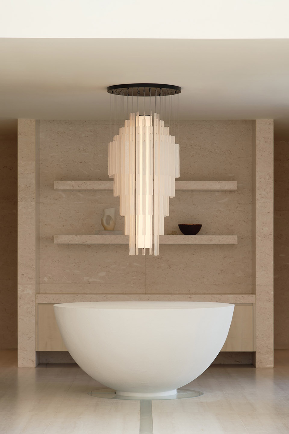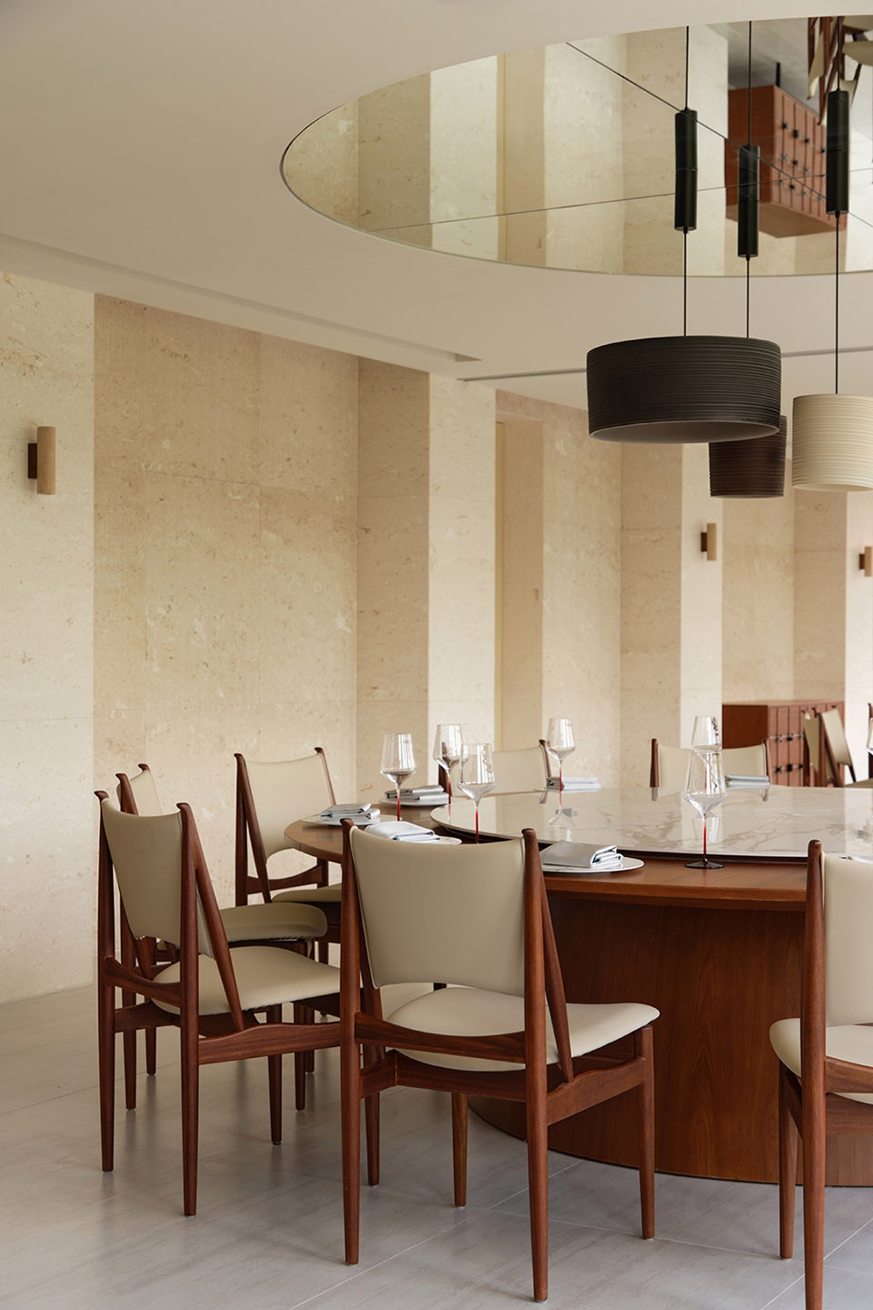 步入三楼的中餐厅,节奏再度切换。整体空间以纯白为基调,在极简中呈现如教堂般的庄重感受。白色石材构成主视觉框架,排列有序的立柱营造层层递进的仪式感。自然光透过外立面开窗洒落其间,强化光影的秩序与层次,空间在静谧中具备温度与流动感。入口处设置的定制艺术装置呼应整体氛围,悬挂式灯具的光线顺势垂落,穿梭于柱列与石面之间,勾勒出柔和的明暗过渡,也强化了空间的精神属性。