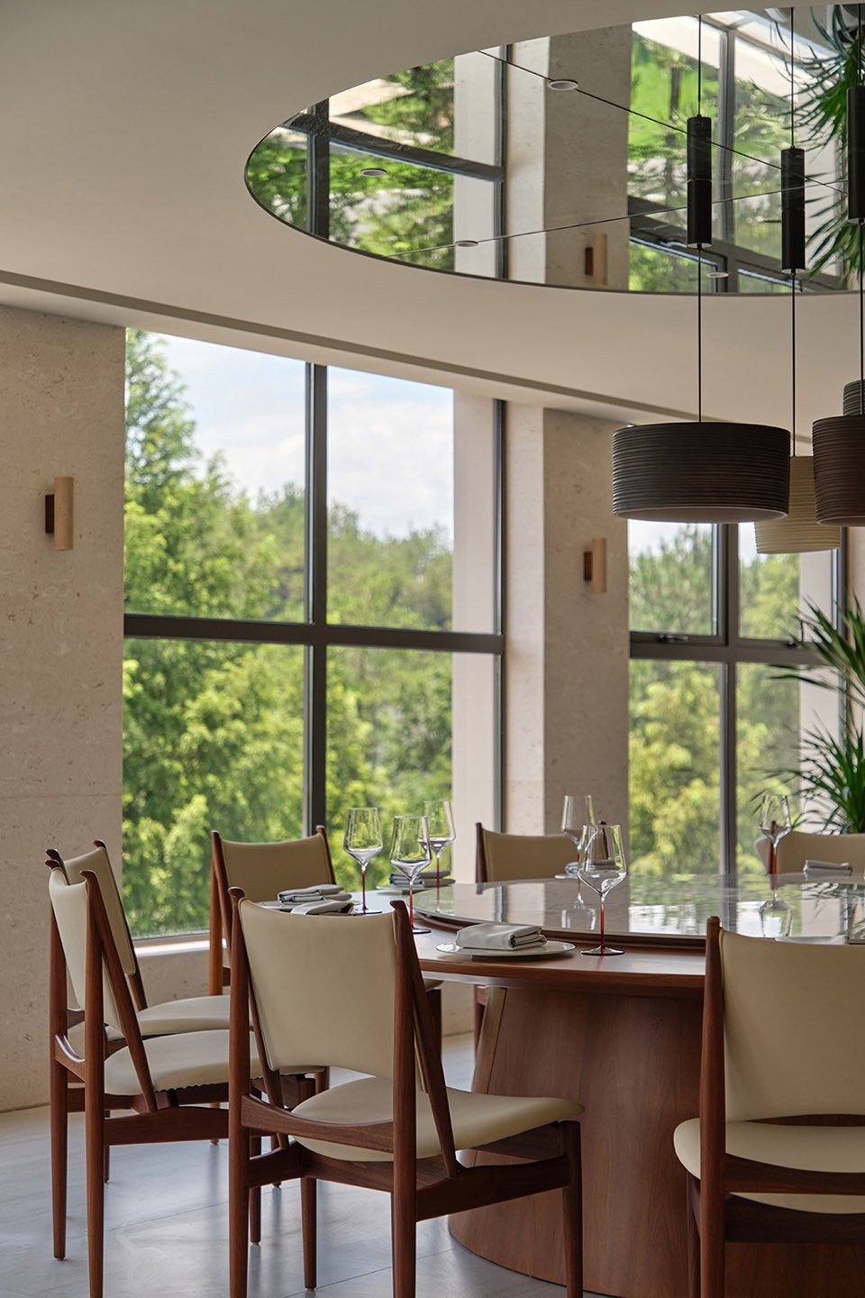 步入餐厅,自然语言进一步延伸。洞石、红砖、大理石等天然材料成为视觉主调,植物的穿插则唤起人与自然的柔性链接。