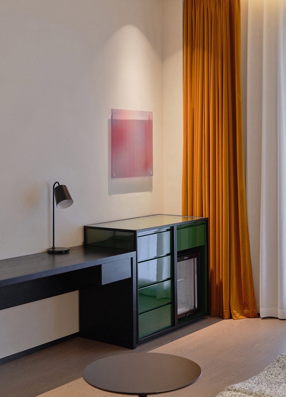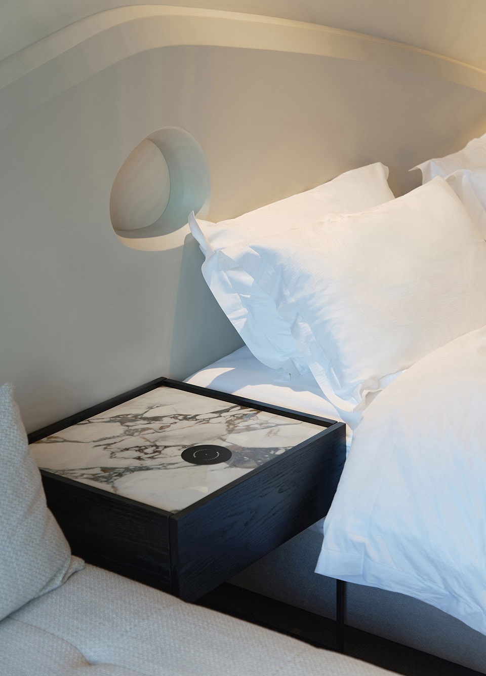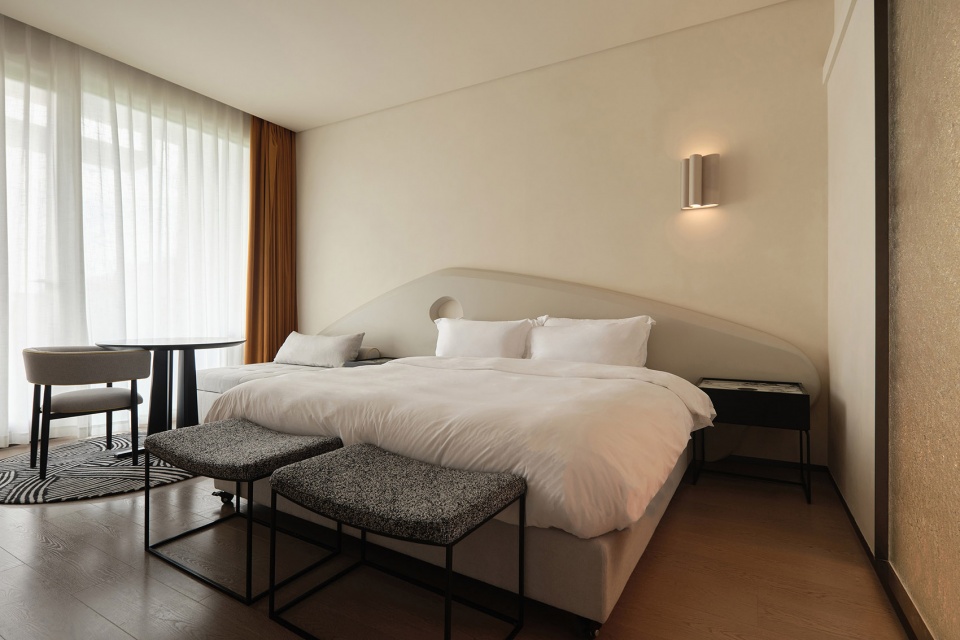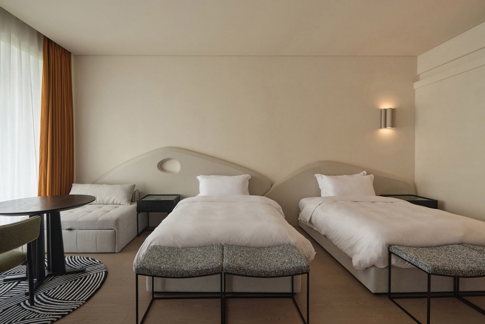 The guestroom corridors transform into scenes of rhythm and artistry. Paved in red stone and complemented by custom-designed carpets, the passageway unfolds with a cadence of color and geometric composition beneath one’s feet. This vibrant accent injects rhythm into the journey, bridging the purity of the interior space with the purity of the surrounding landscape. Inside the guestrooms, the core theme of sport continues. A sculptural installation inspired by movement defines the backdrop wall, where tension and release articulate the transition from public to private space.