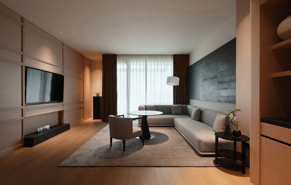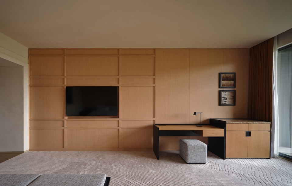 客房区域的过道则转换为更具节奏感与艺术感的场景。通道以红色石材铺就,搭配定制设计地毯,以色彩的韵律与几何构成铺陈于脚下,在纯粹的空间与纯粹的景观之间注入一抹富有节奏的亮色。房间内部延续了公区的运动主题内核,以运动雕塑构建背景墙体,张弛之间,完成从公共到私密的场景切换。