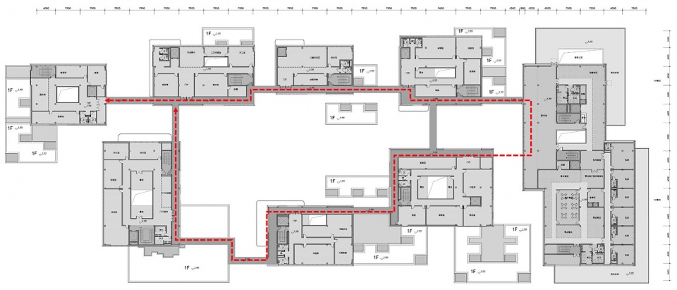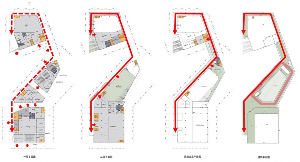 与此同时,设计还加入了三个环形动线将它们互相连接:“综合服务楼”的“运动环”,“小镇中心”二楼的“兴趣环”及一楼的“探索环”。这些具有不同的空间形态特征的“环”不仅仅是高效的交通空间,也是重要的活动及交流场所。