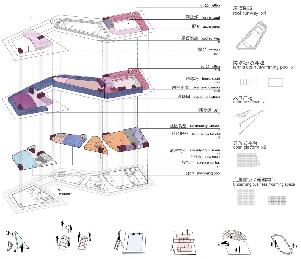 ▼ 综合服务楼各楼层功能及运动环分析图,Analysis diagram of functions and sports loop on each floor of the Sports Complex