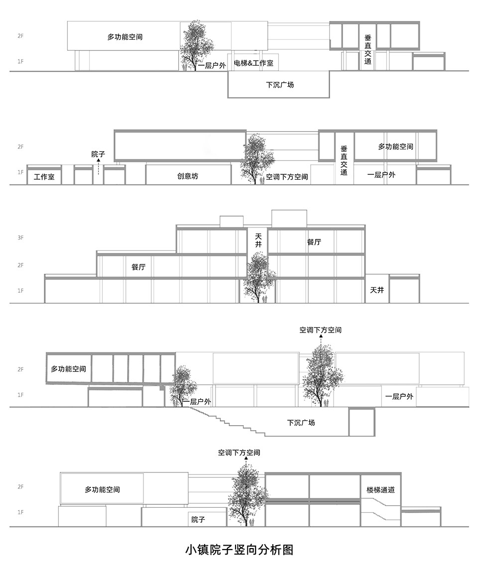 ▼剖面-小镇中心的多级庭院,Sections – Multi-level courtyards of Village Center