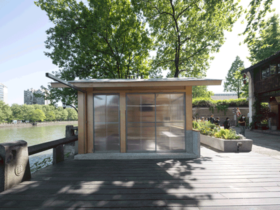 Canal Pavilion Post is a public welfare renovation project of a temporary building, located by Gongchen Bridge on the Hangzhou section of the Beijing-Hangzhou Grand Canal. It covers an area of 10 square meters, stands over 2 meters high, and has a simple wooden structure. We are used to calling it “Little Box” because of its square and simple shape, which makes it easy to understand at a glance. The client hopes to transform this originally vacant wooden house into a scenic post that provides free drinking water and rest spaces for tourists. Meanwhile, it will serve as a publicity spot for the street and Gongchen Bridge – a landmark historical building in Hangzhou – and sell some tourist souvenirs and cultural and creative products.