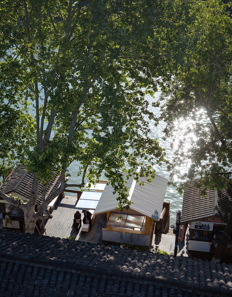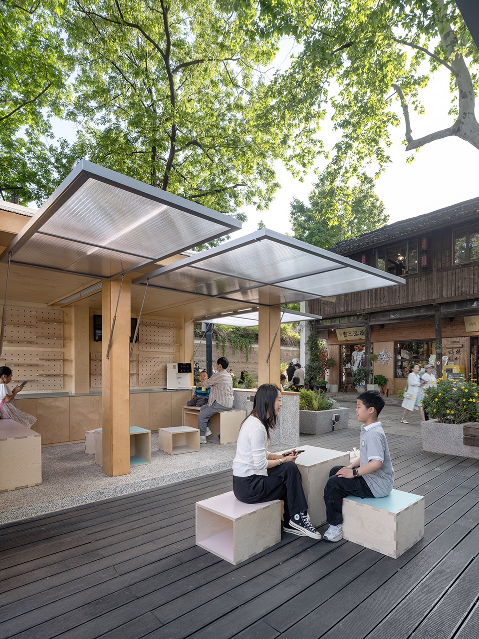In the area around Qiaoxi Straight Street in Hangzhou, there are several small wooden houses that operate small tea and retail businesses. To visitors, these wooden houses are like kitchens—off-limits to them. However, as a public welfare space offering free drinking water and rest for visitors, the small post should be open and borderless: visitors can sit down whenever they arrive and leave whenever they wish. From this perspective, it is more like a scenic pavilion or a wind-and-rain corridor. Therefore, it must be open enough. First, in terms of sightlines: when standing on the street, visitors should be able to look directly at the canal through the post. Second, in terms of circulation: it should no longer have a “door” but instead be an entirely open facade, weakening the sense of boundary brought by “entering and exiting.” Finally, in terms of layout: furniture such as counters and chairs are all placed against the surrounding walls, eliminating the distinction between inside and outside and, incidentally, achieving decentralization.