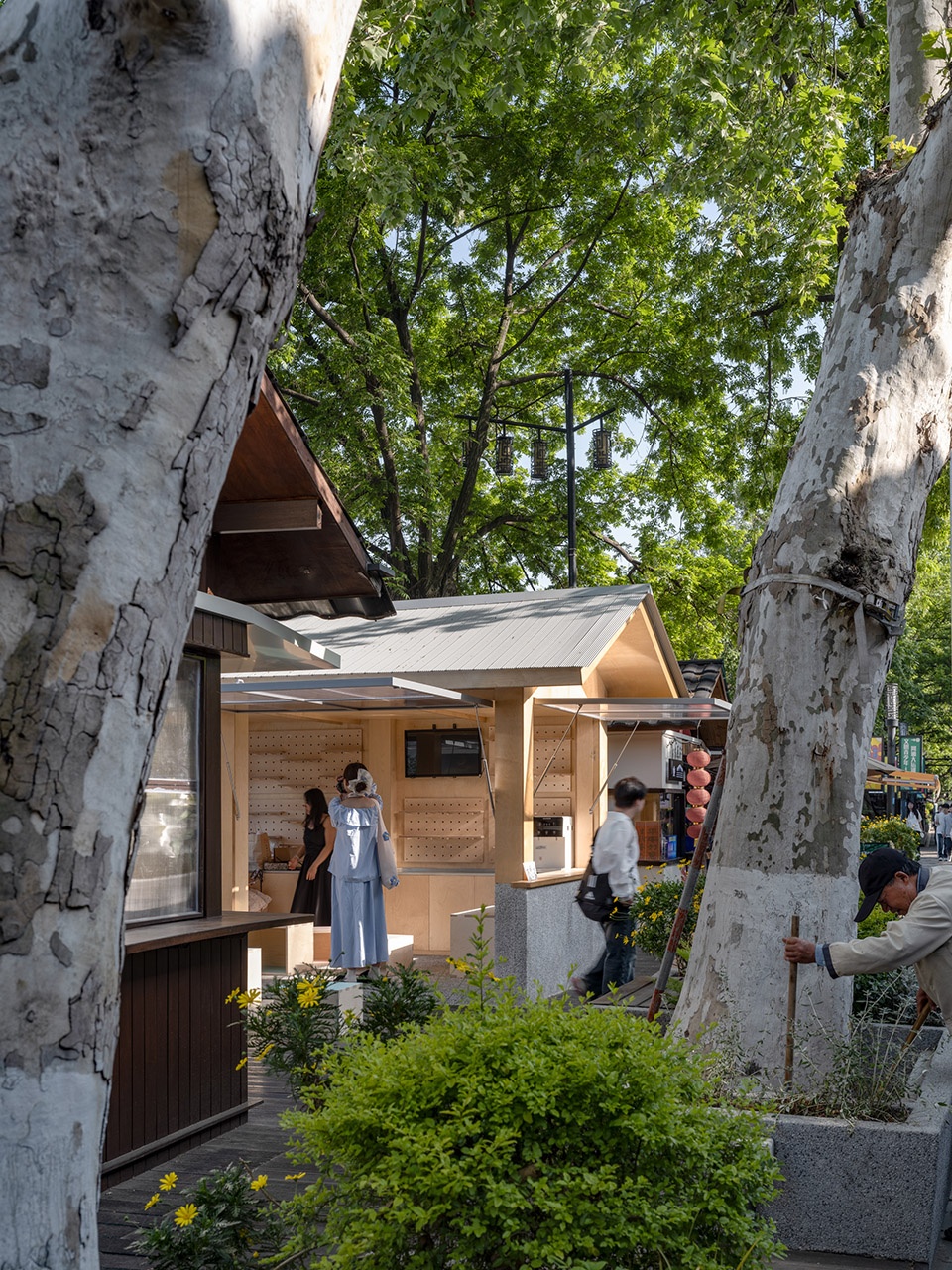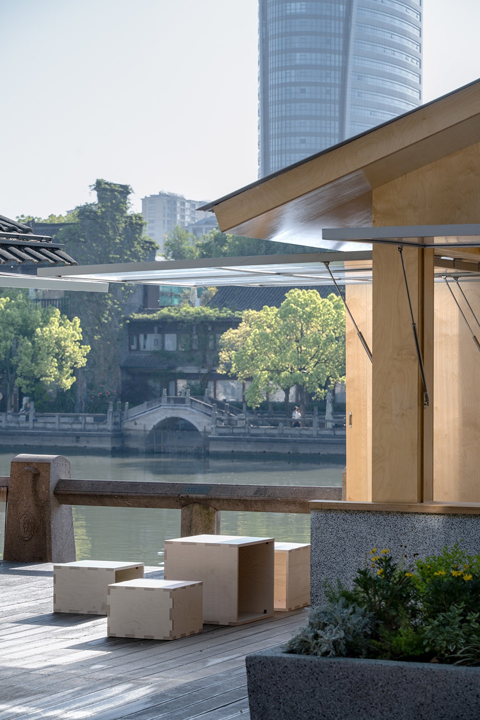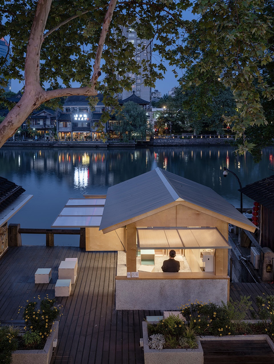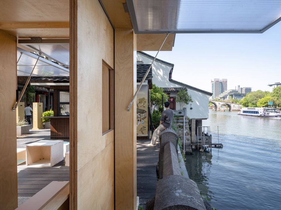 杭州桥西直街这一带,有若干小木屋,做的都是小茶饮、小零售生意。这些木屋对游客来说,是一个厨房:闲人免进。但作为一个免费提供游人喝水休憩的公益场所,小驿站应该是开放、无边界的:随到随坐,随起随走。从这个角度来说,它更像是一处景观亭或风雨廊。因此,它得足够开放:首先是视线,游客站在街上,透过驿站,直接看向运河。其次是流线,它不该再有“门”,而是一个整体敞开的面,减弱“进出”带来的边界感。最后是布局,柜椅等摆设均靠周边墙面,抛弃了内外之分,也顺便去了中心化。