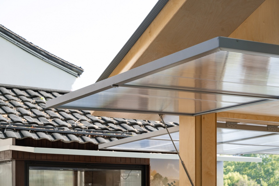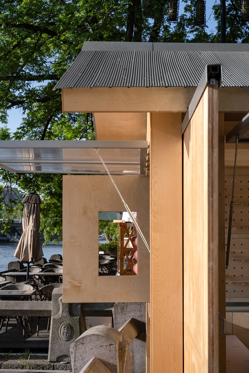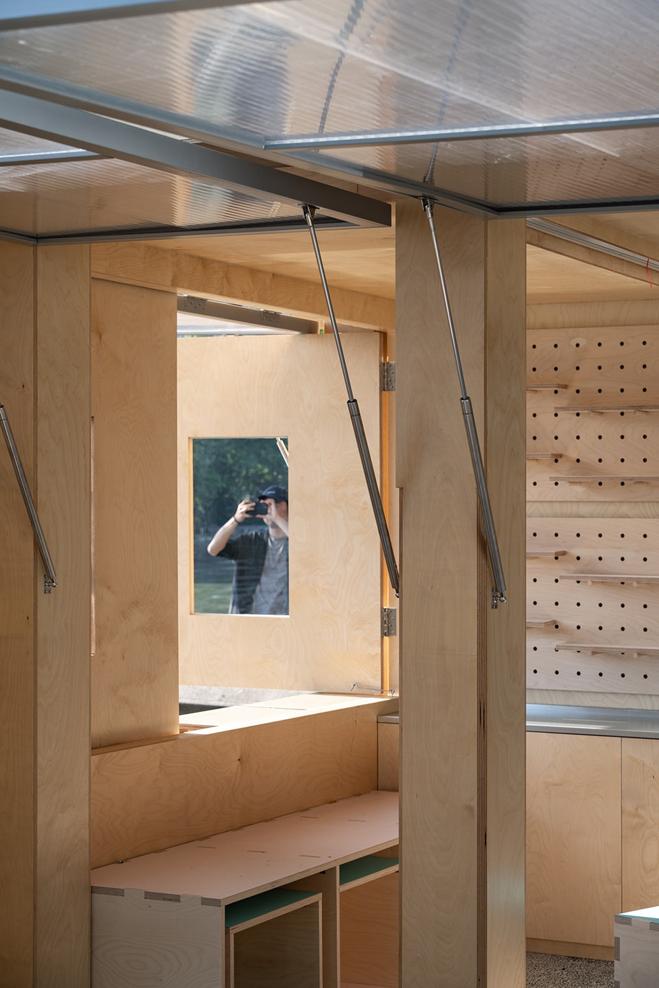 所有活动面由关闭到展开,再到关闭,需要经过一系列固定的程式。或由插销,或经锁扣,或是把手助力,前后有序。驿站甚至因此有了一种仪式感,像上下班一样,切换模式:在闭合状态下,它是个拘谨的小房子,而在开放状态下,它是一处公共休憩亭。