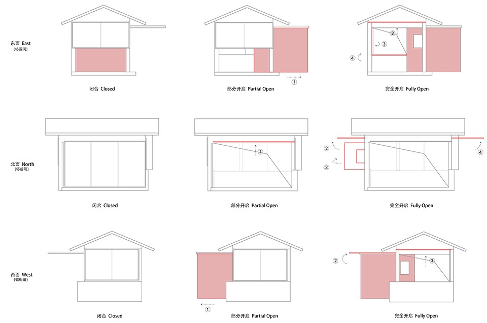 但在向游客完全开放之余,驿站还需提供志愿者工作休息,设施储存等功能——它得是个微型建筑。因此,某种程度上,它可以变形:入口位于长边的小平台处,整个立面可向上打开,成为一种遮盖。临运河一面,有四道开启,上半墙展开成为雨棚,内墙分大小两扇,小扇向运河展开,成为景窗,大扇可以随移轨侧向推出,成为街区文化宣传背景板,然后藏在腰部隔板再上翻,成为窗台。