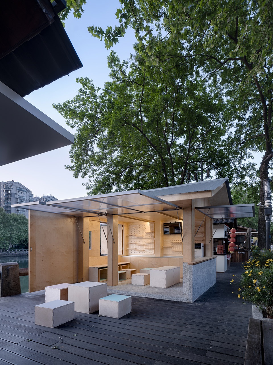 There are architectural style constraints for buildings around Gongchen Bridge, and the renovation could not deviate from the motif of “gabled wooden houses”. With the construction cost being extremely compressed, there were initially no plans to modify the roof or structure. However, during construction, it was found that although the original eaves and black aluminum tiles were consistent with the surrounding wooden houses, they still felt overly heavy in this specific site. Thus, the plan was revised temporarily: without altering the structure, facade panels were used for cladding, and the roof metal sheets were replaced. In this process, the material texture of marine plywood—used as the main material—was wasted. By nature, it is a type of board that should showcase modularity, joint seams, and side lines, but in the end, it was reduced to a simple cladding material.